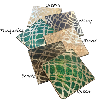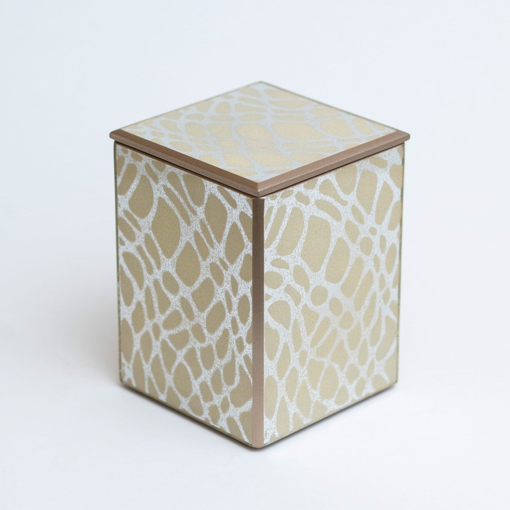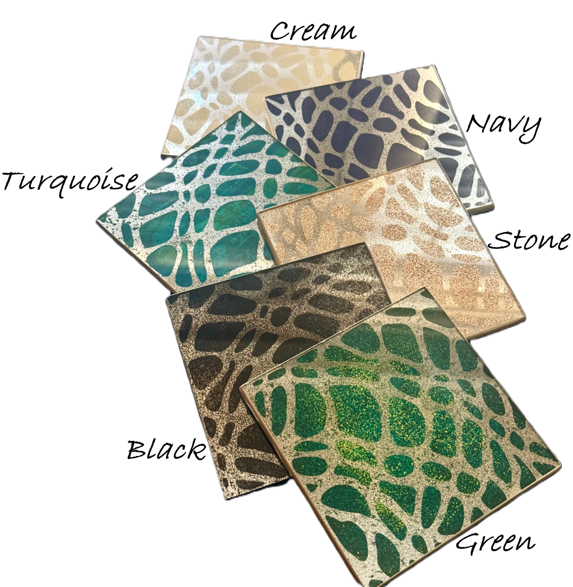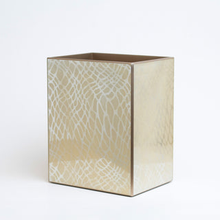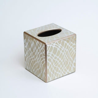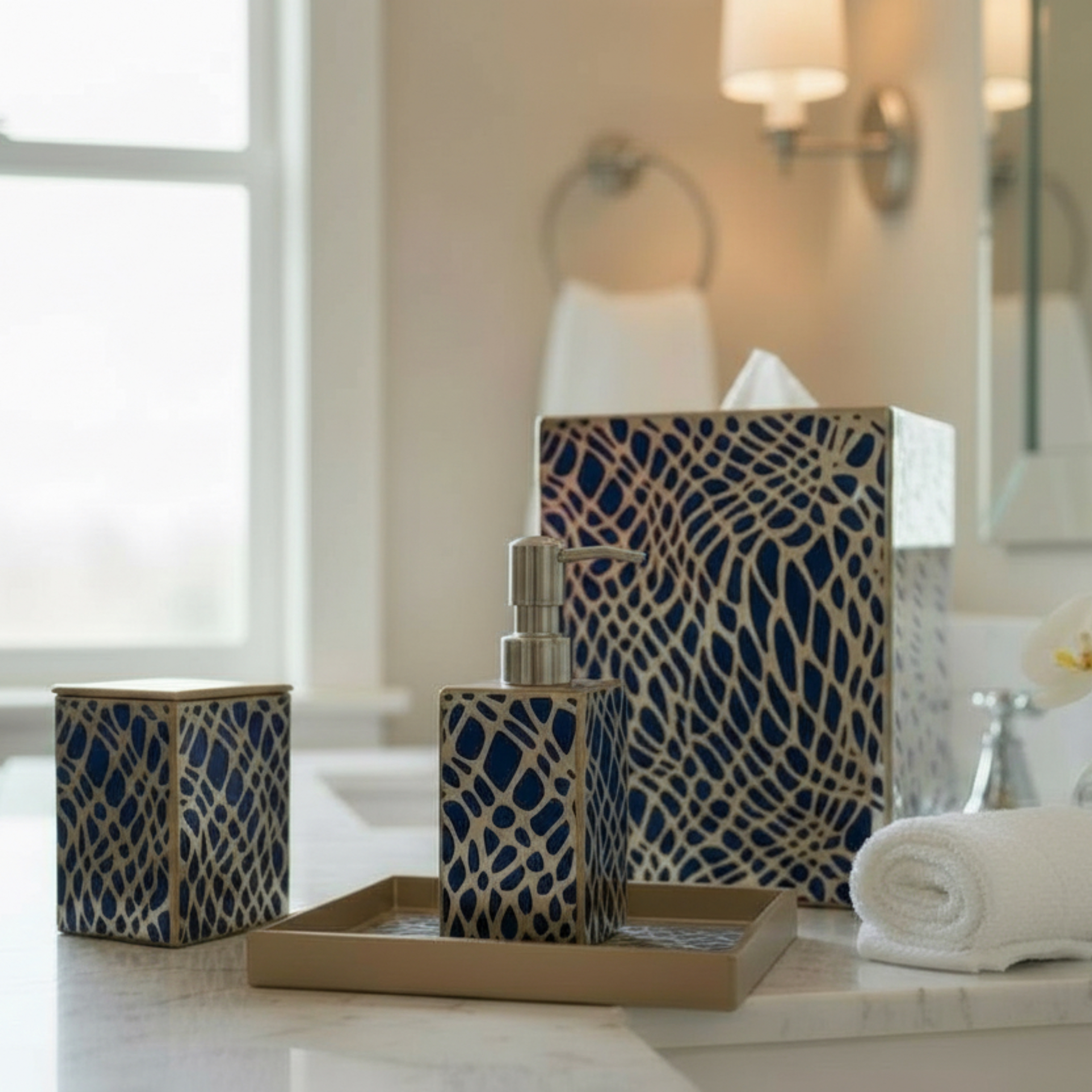 A whimsical mesh pattern that flashes a different personality in each color. Entirely crafted by hand from start to finish, this luxury bath collection is made of artist hand-painted mirror in a version of verre églomisé. Made in Peru.