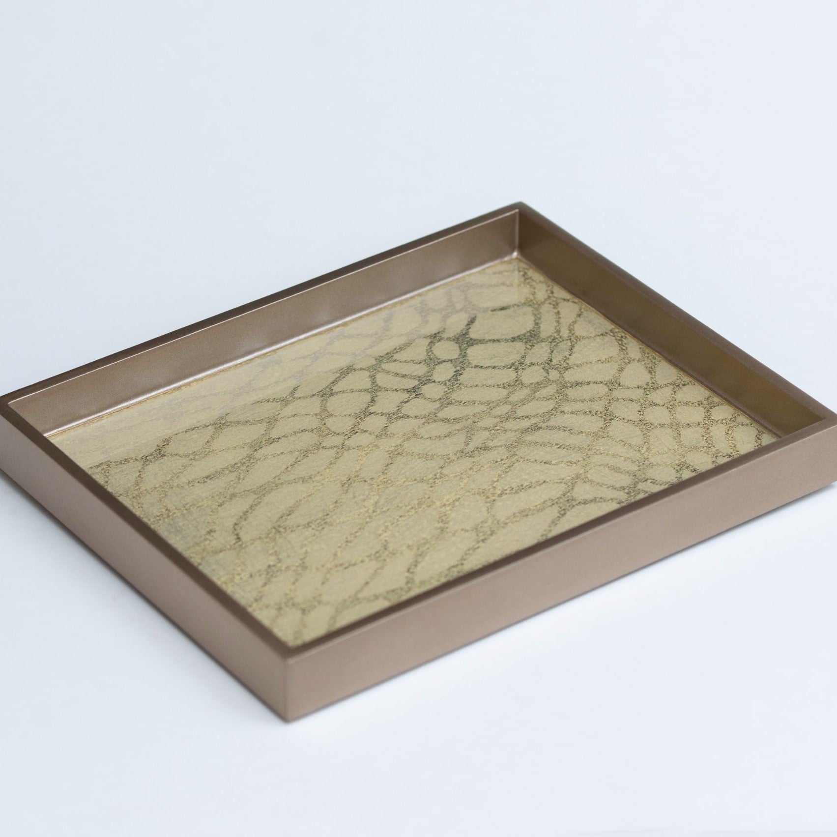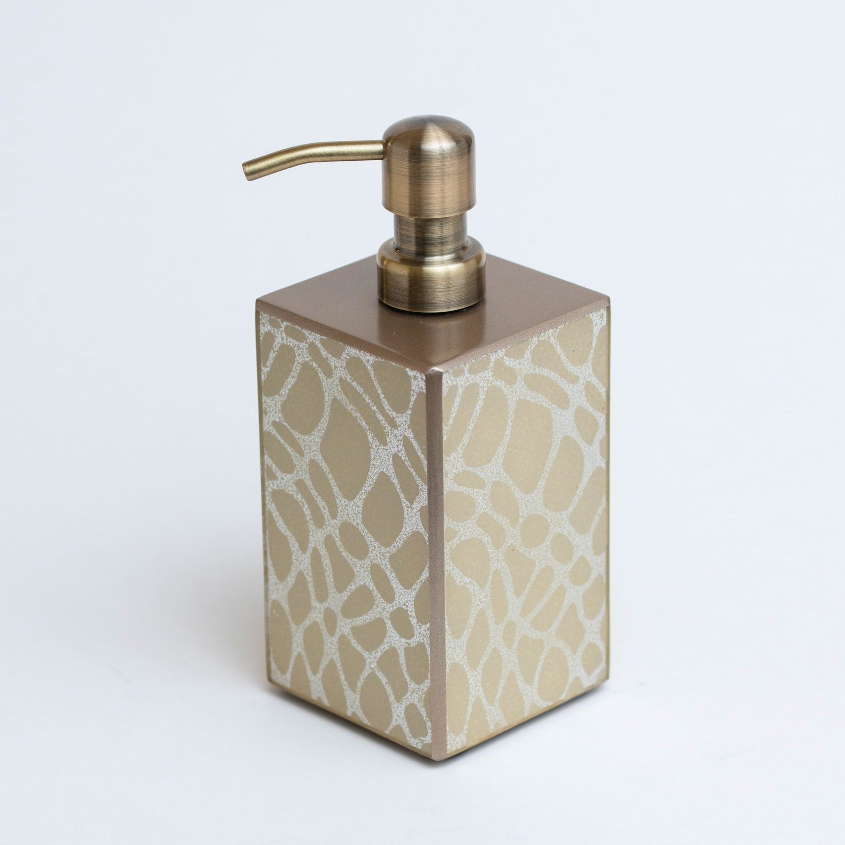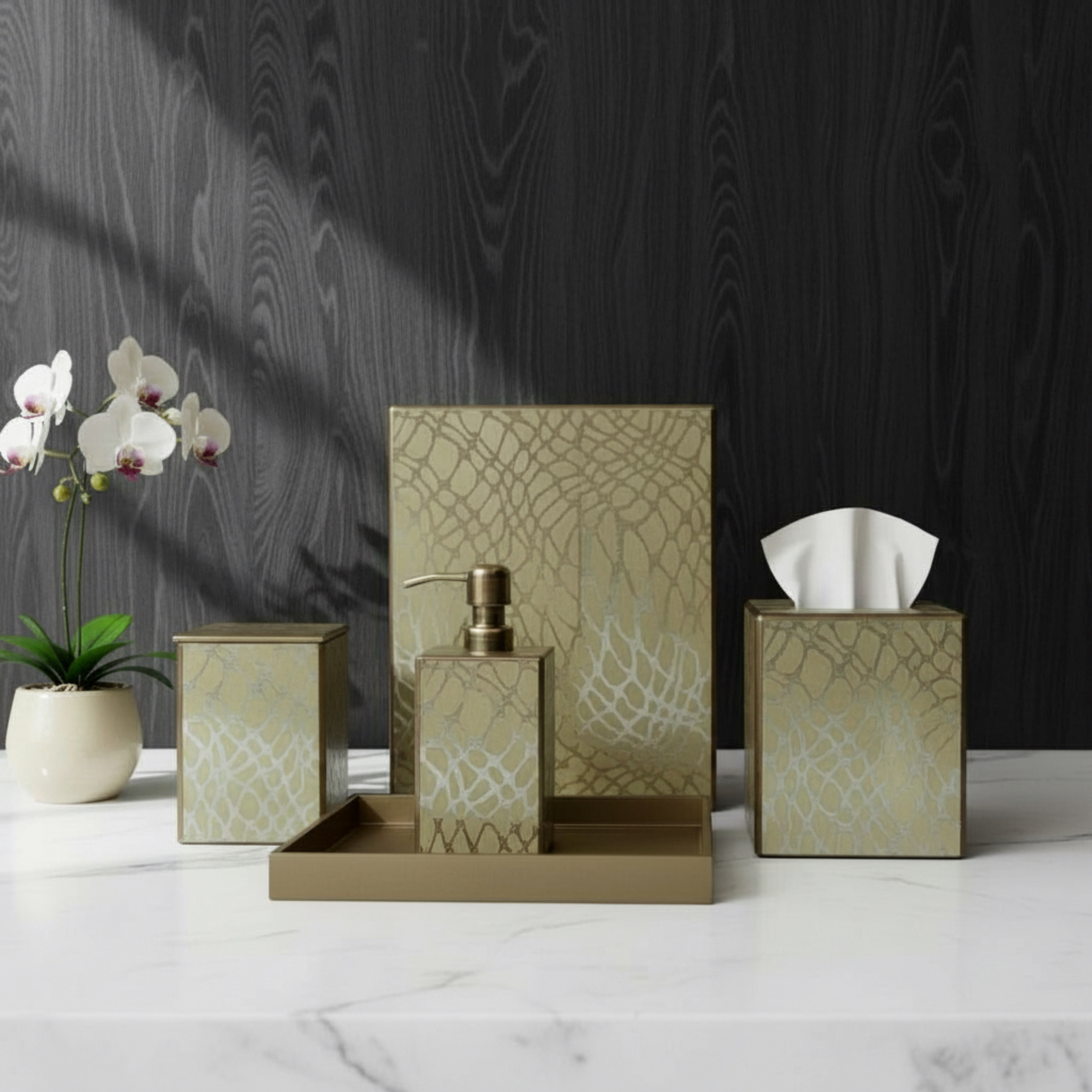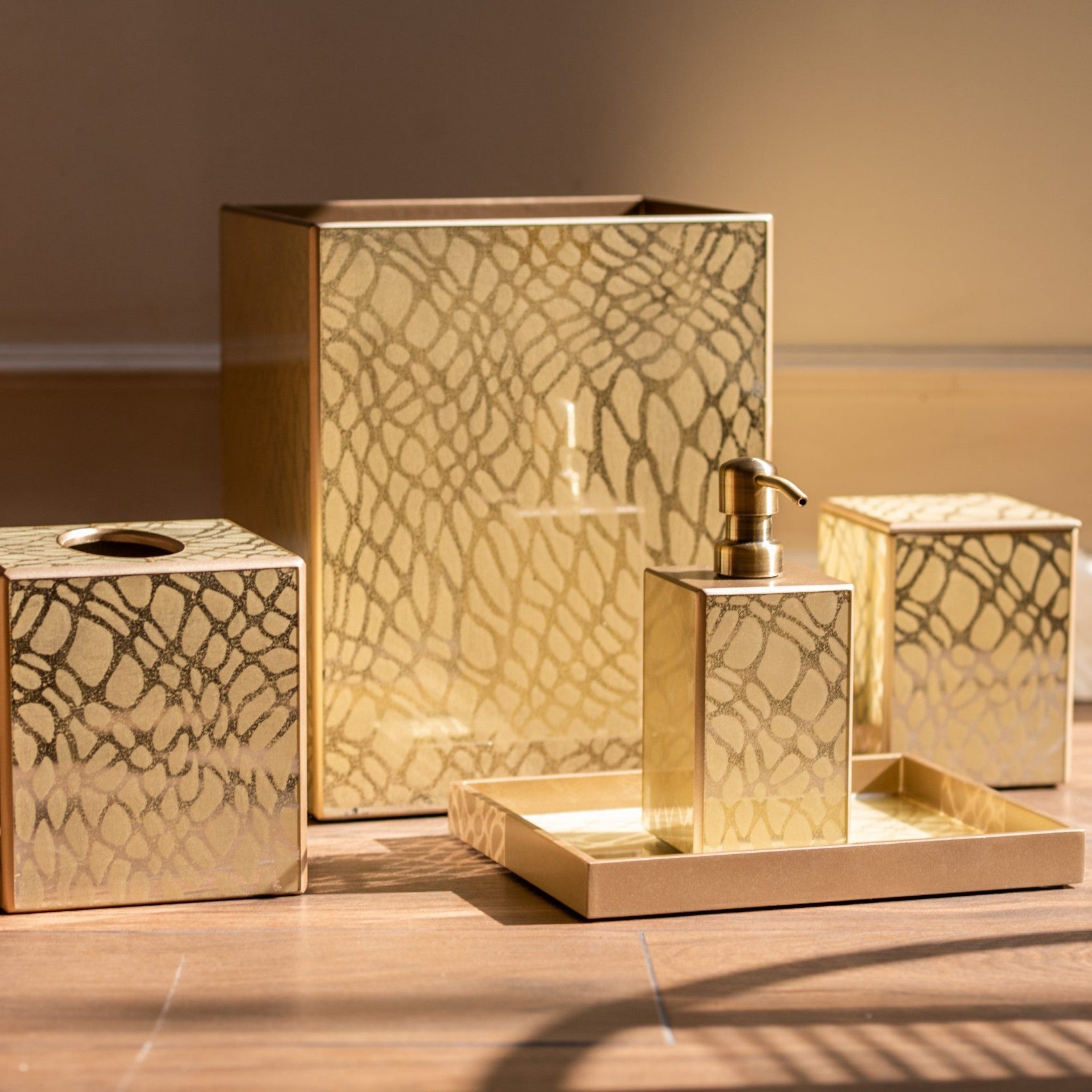 A whimsical mesh pattern that flashes a different personality in each color. Entirely crafted by hand from start to finish, this luxury bath collection is made of artist hand-painted mirror in a version of verre églomisé. Made in Peru.