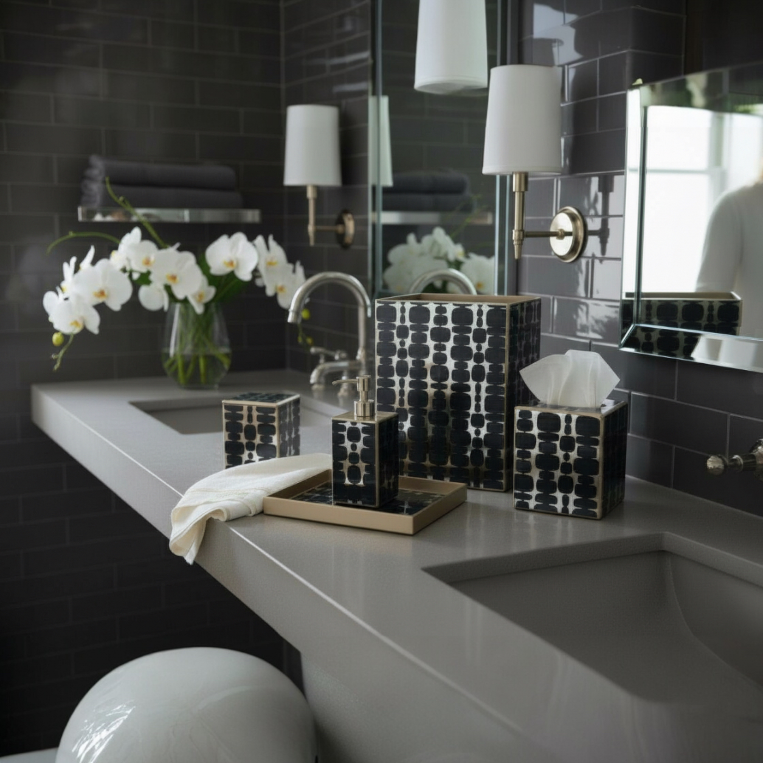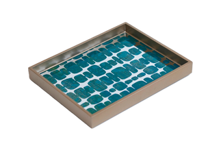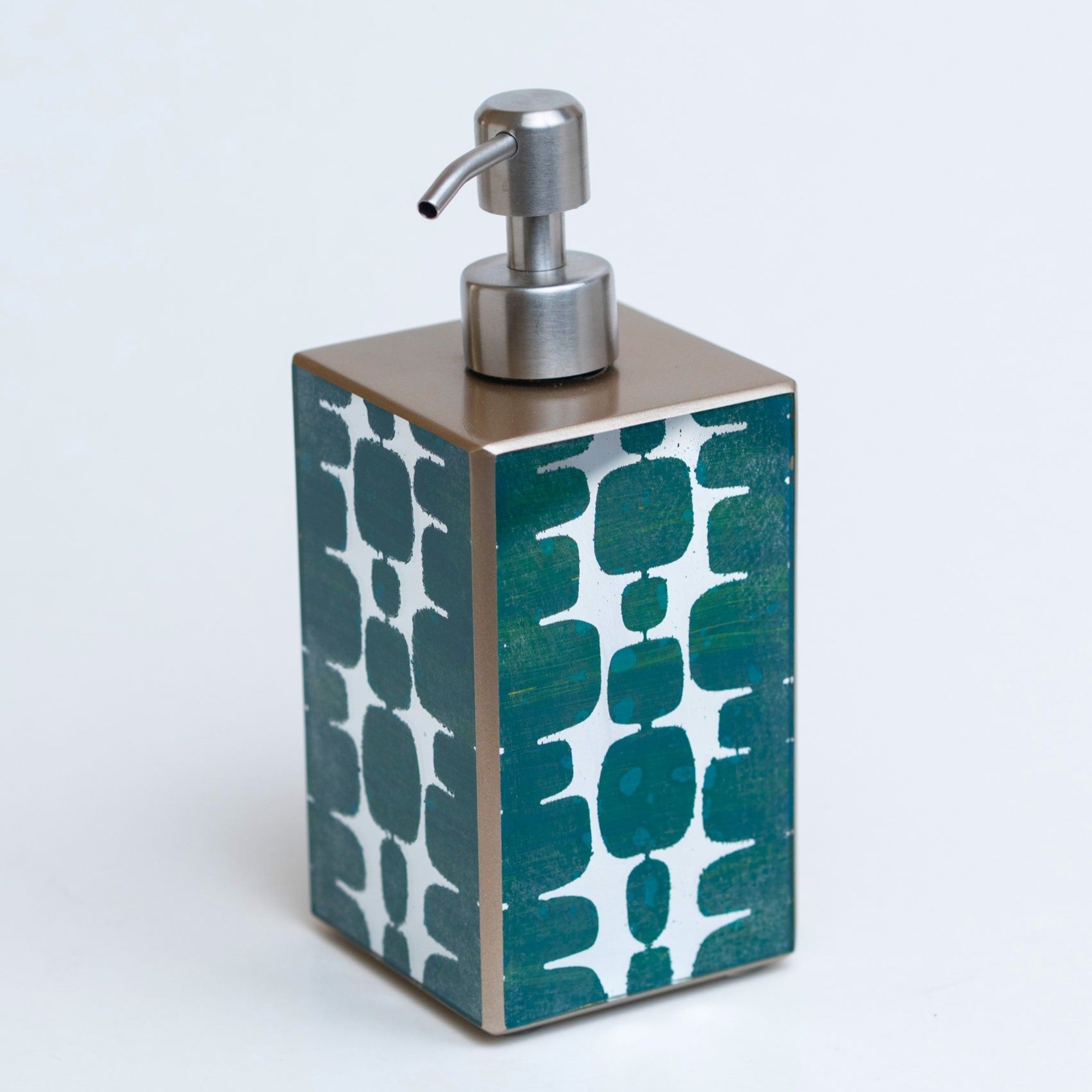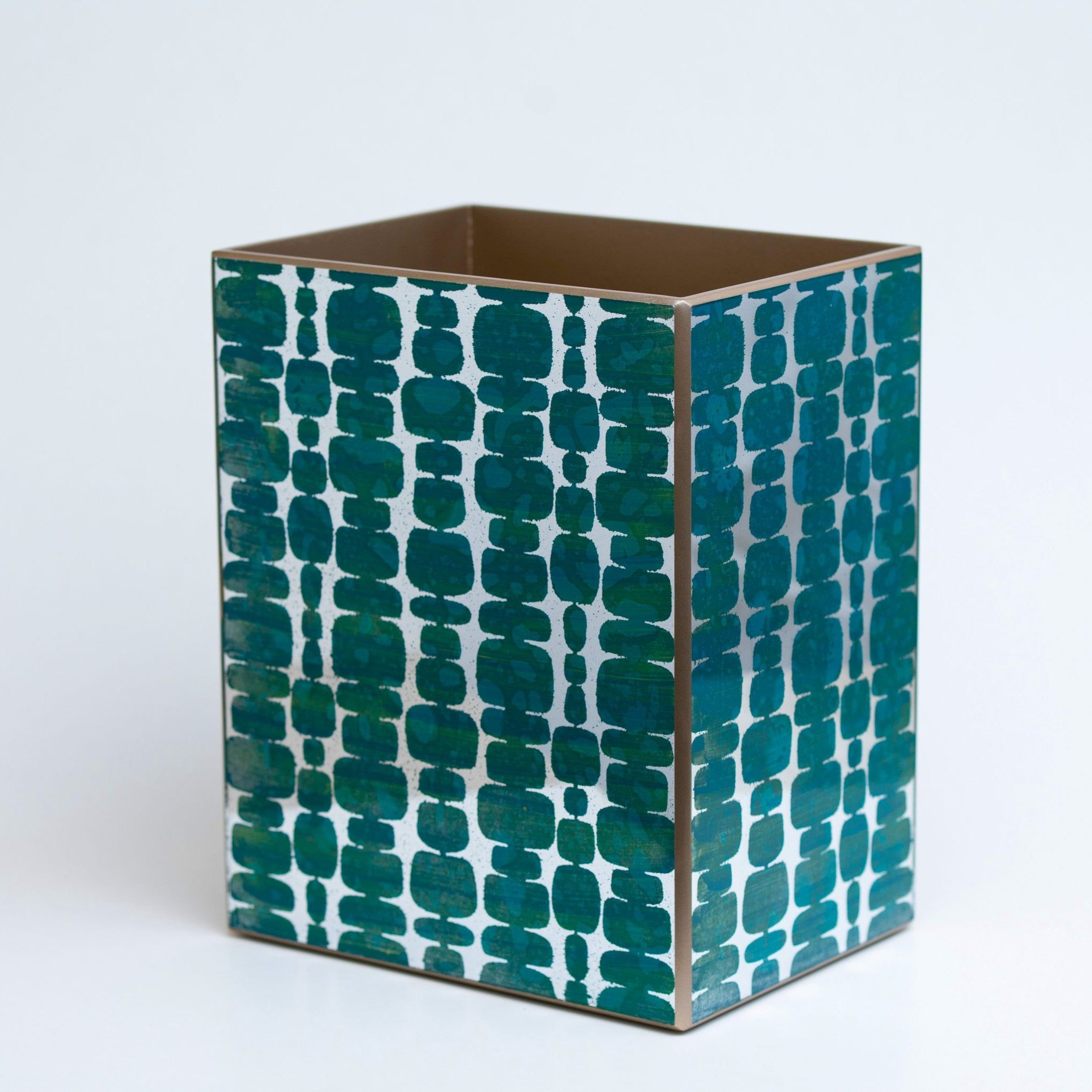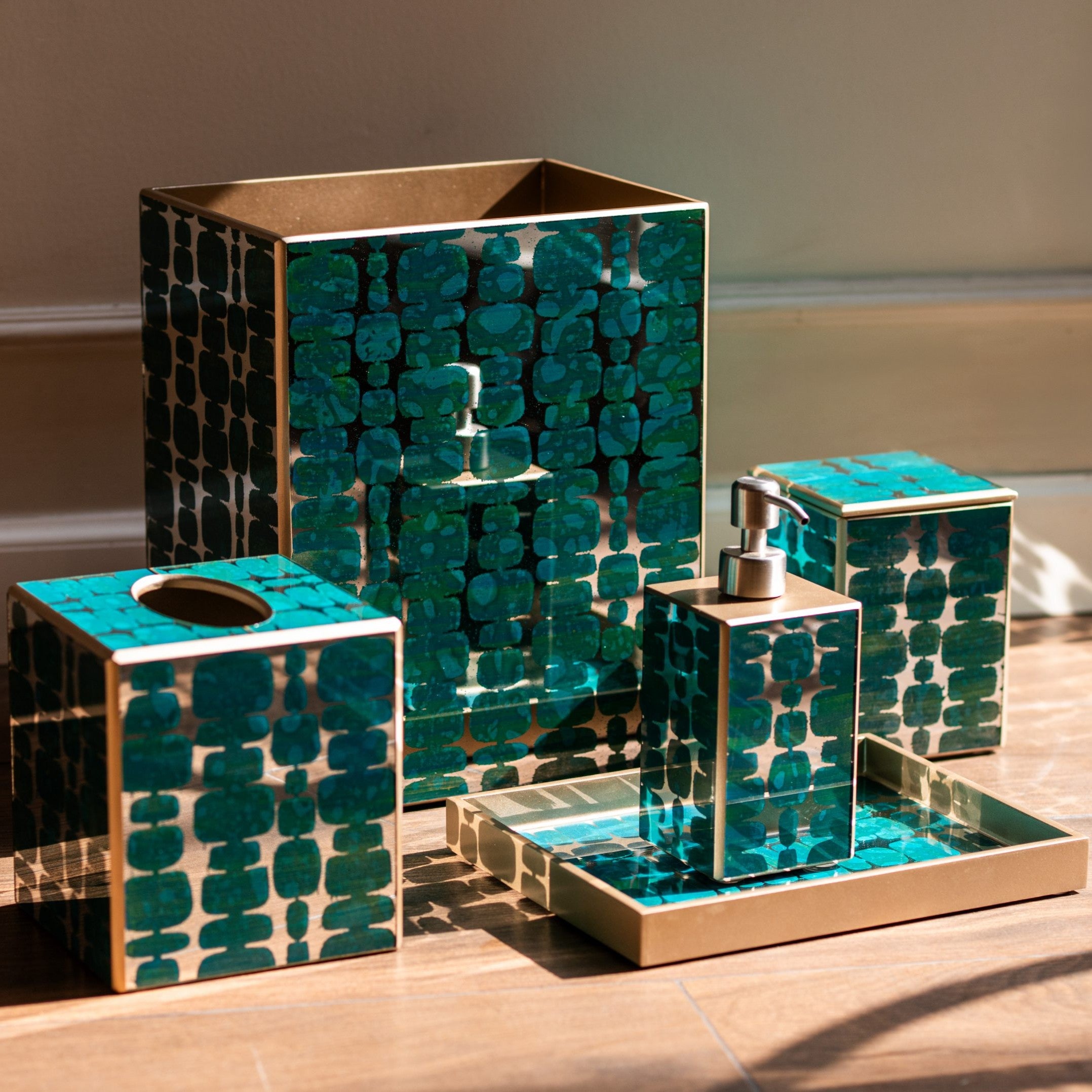 This graphic pattern gives a chic, totem-like feel. From soft and earthy to colorful and bold, give your bath an addition of functional art. Entirely crafted by hand from start to finish, this luxury bath collection is made of artist hand-painted mirror in a version of verre églomisé. Made in Peru.