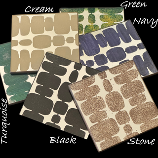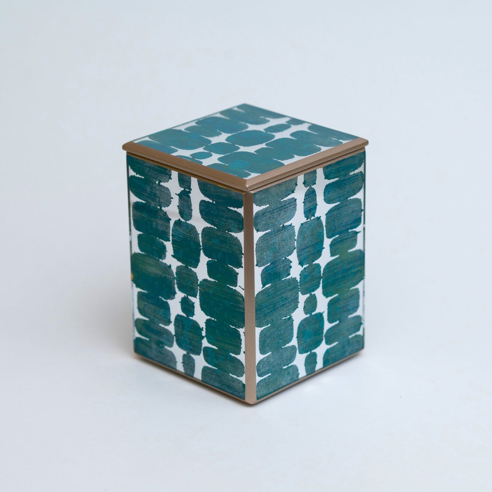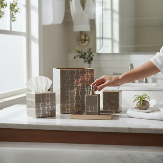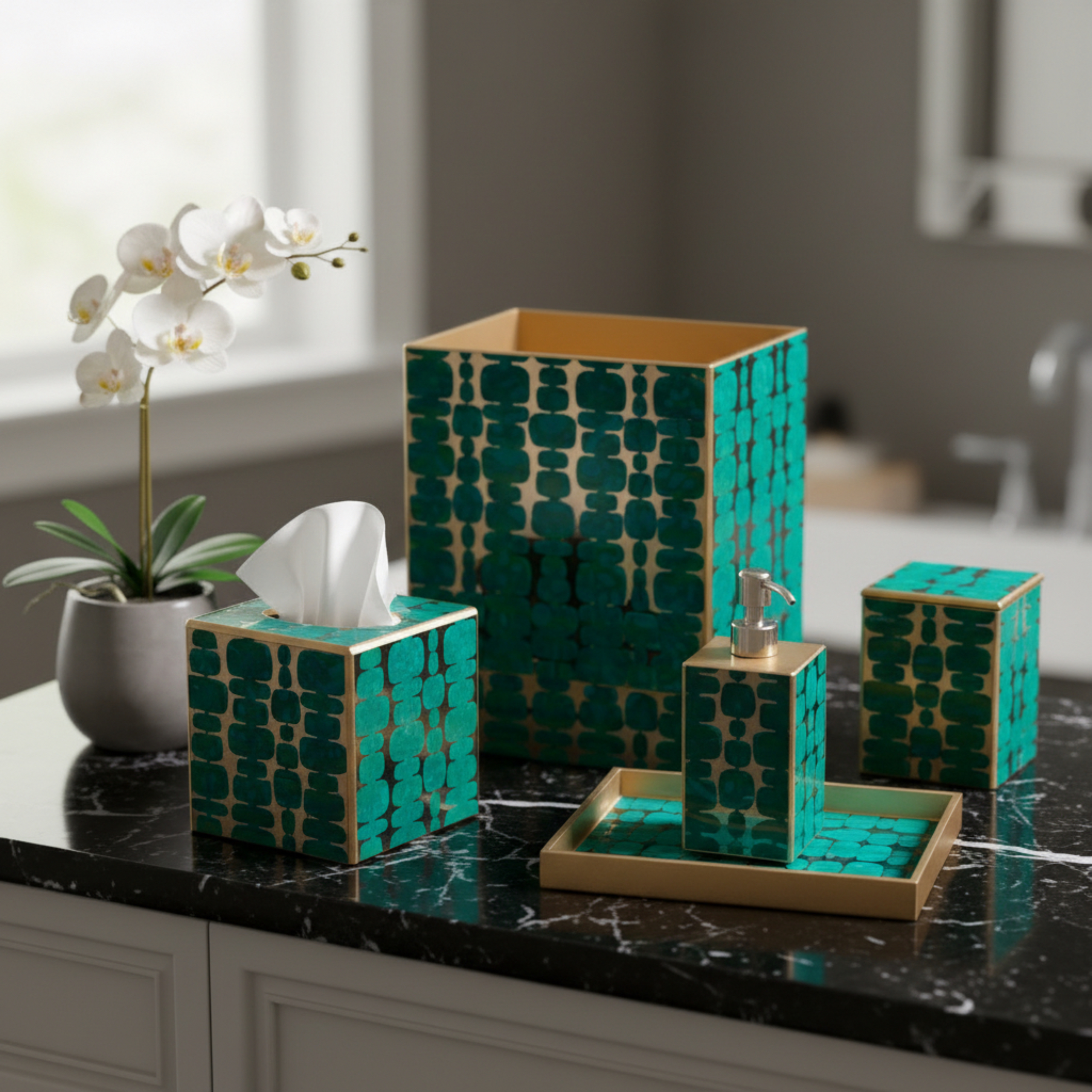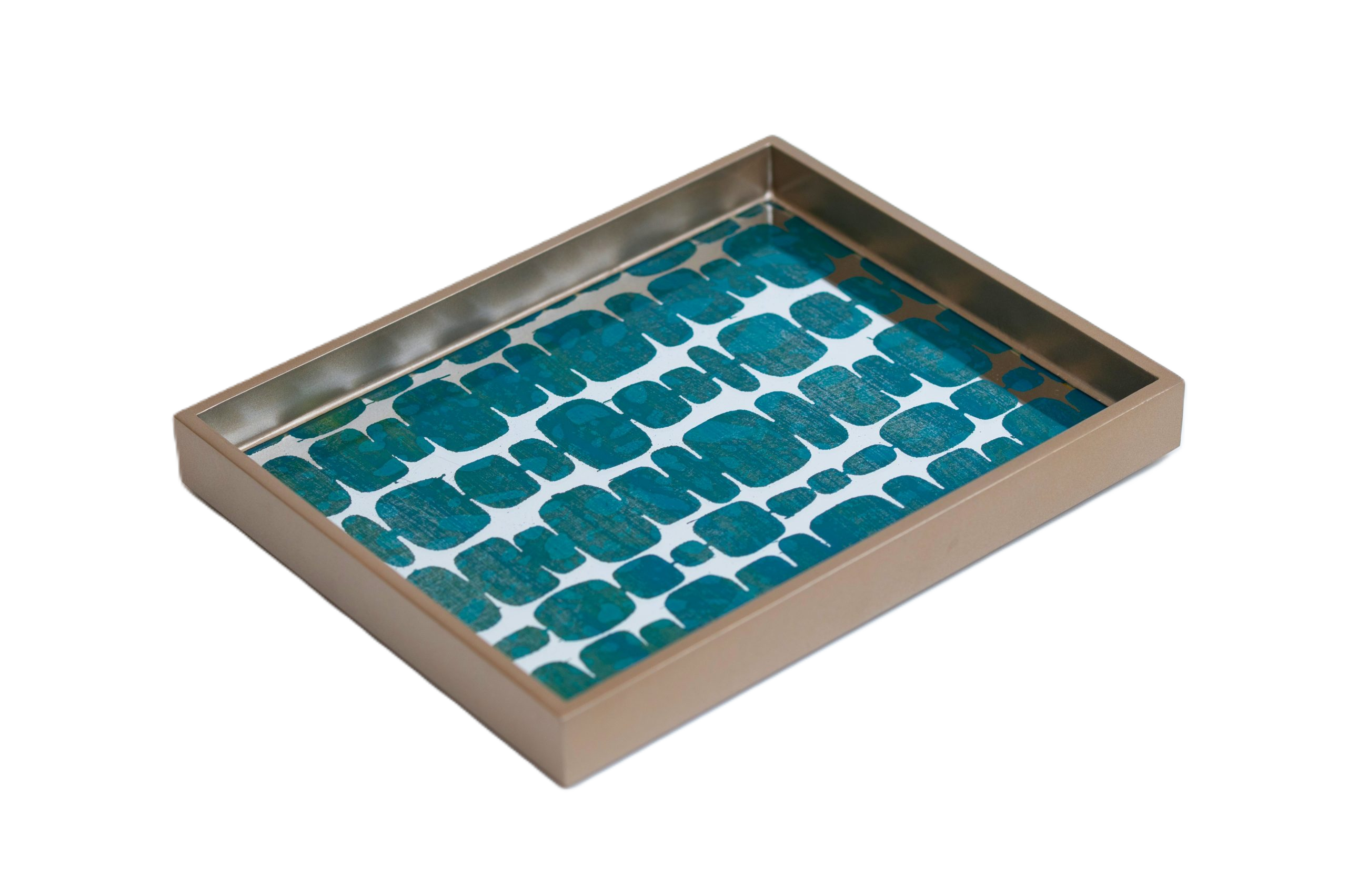 This graphic pattern gives a chic, totem-like feel. From soft and earthy to colorful and bold, give your bath an addition of functional art. Entirely crafted by hand from start to finish, this luxury bath collection is made of artist hand-painted mirror in a version of verre églomisé. Made in Peru.