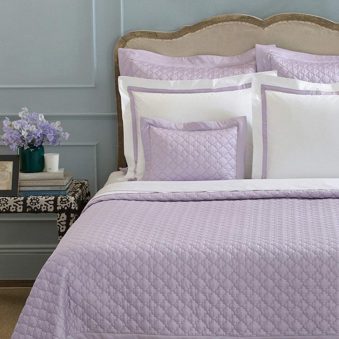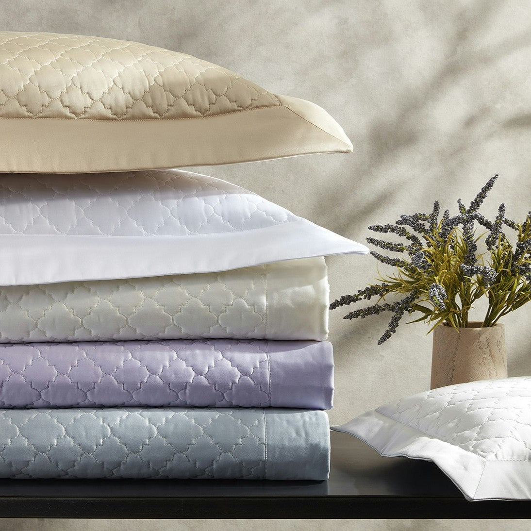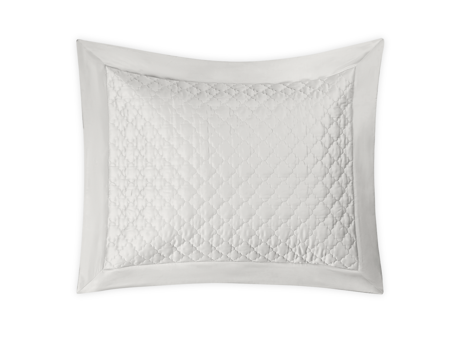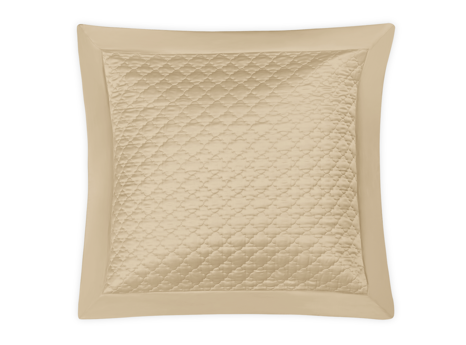 Nocturne cotton sateen is adorned with a quilted quatrefoil design. The fabric has a subtle sheen that epitomizes a refined luxury for today’s home. A tailored, plain cuff on the quilt and shams adds the perfect finish. Made in the USA.