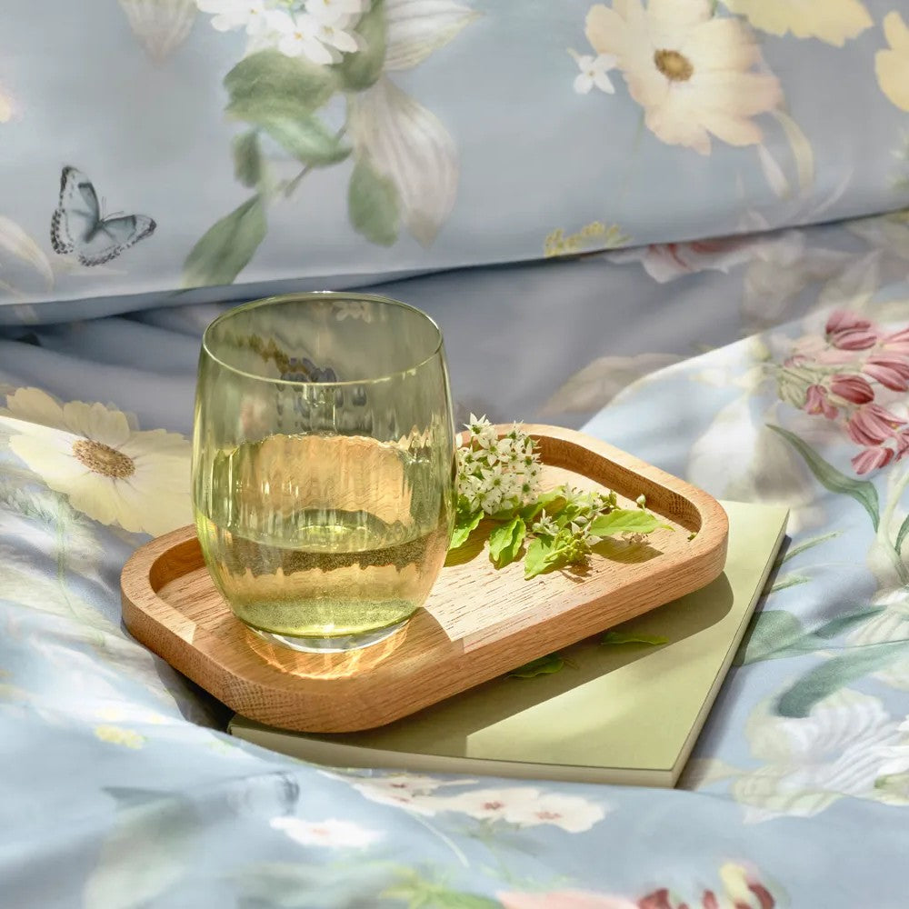In that brief moment between quietly arriving and taking your first deep breath, it almost seems as if the gentle summer breeze is pulling the curtains aside for us: at AVEN, you can simply sit back and watch nature gently swaying. Observe how flowers and leaves dance joyfully back and forth or flutter through the air together with little butterflies. The next gust of wind gently carries the warmth of the sun inside and skillfully blurs the colors and motifs of this bed linen. Weighed at 110 g/m2.