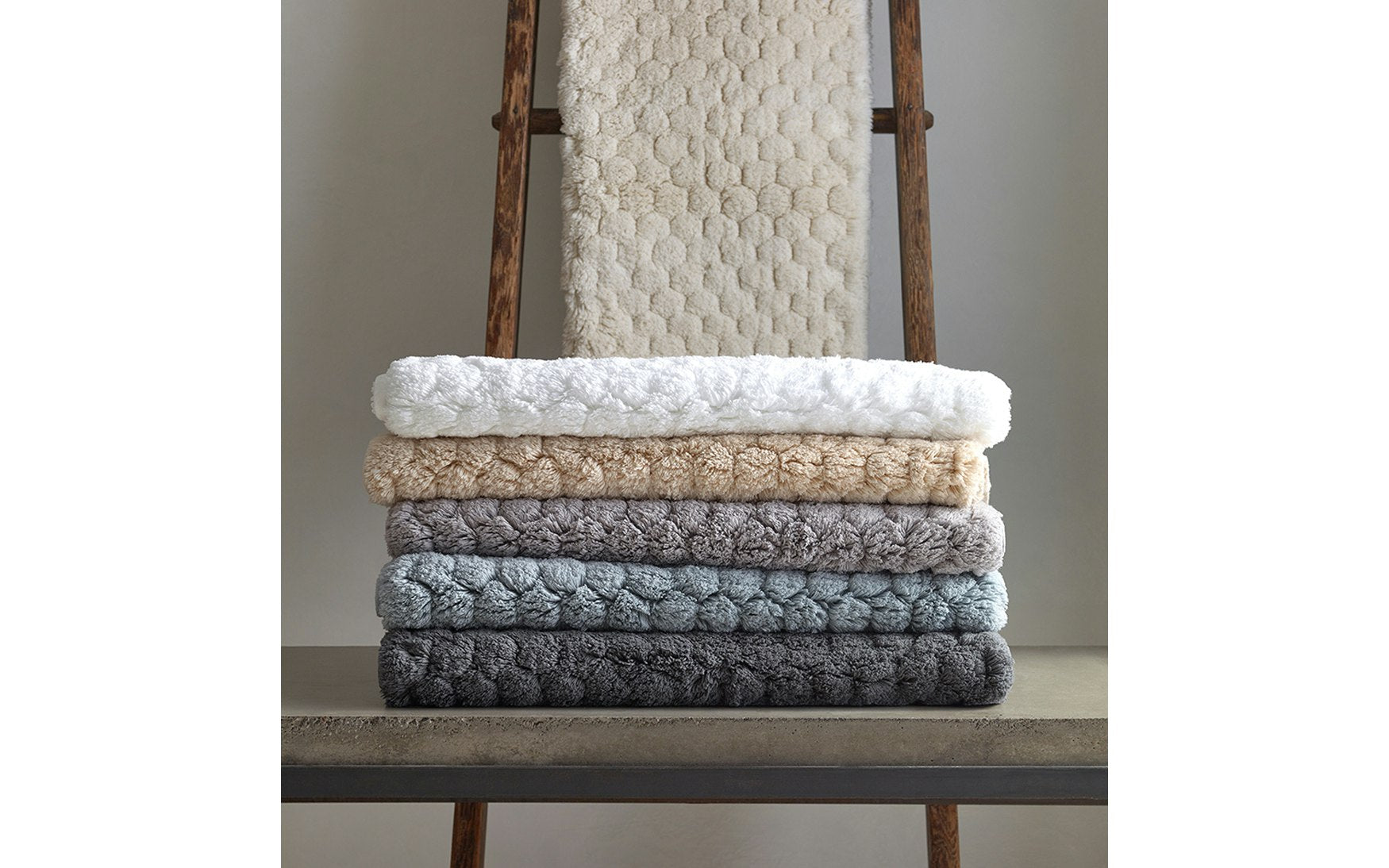 Sculpted long-pile bath rugs matching select colors in Lotus towel collection. 100% Cotton