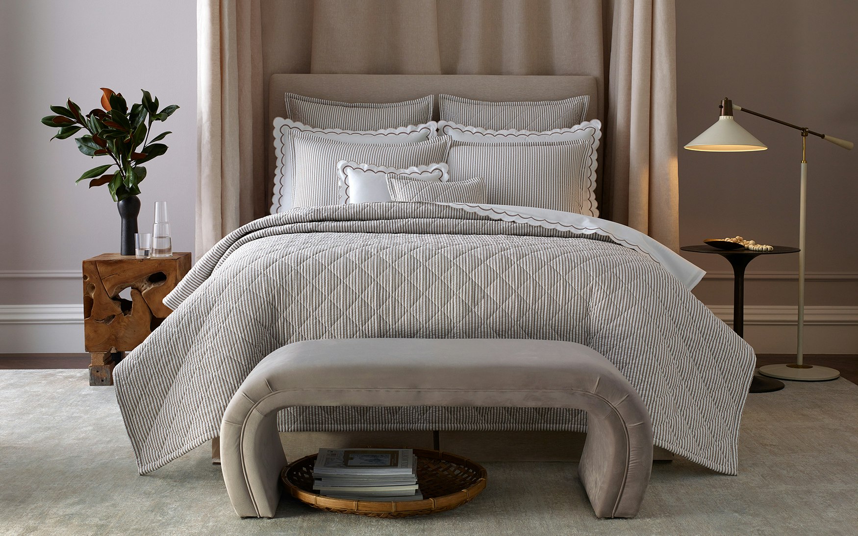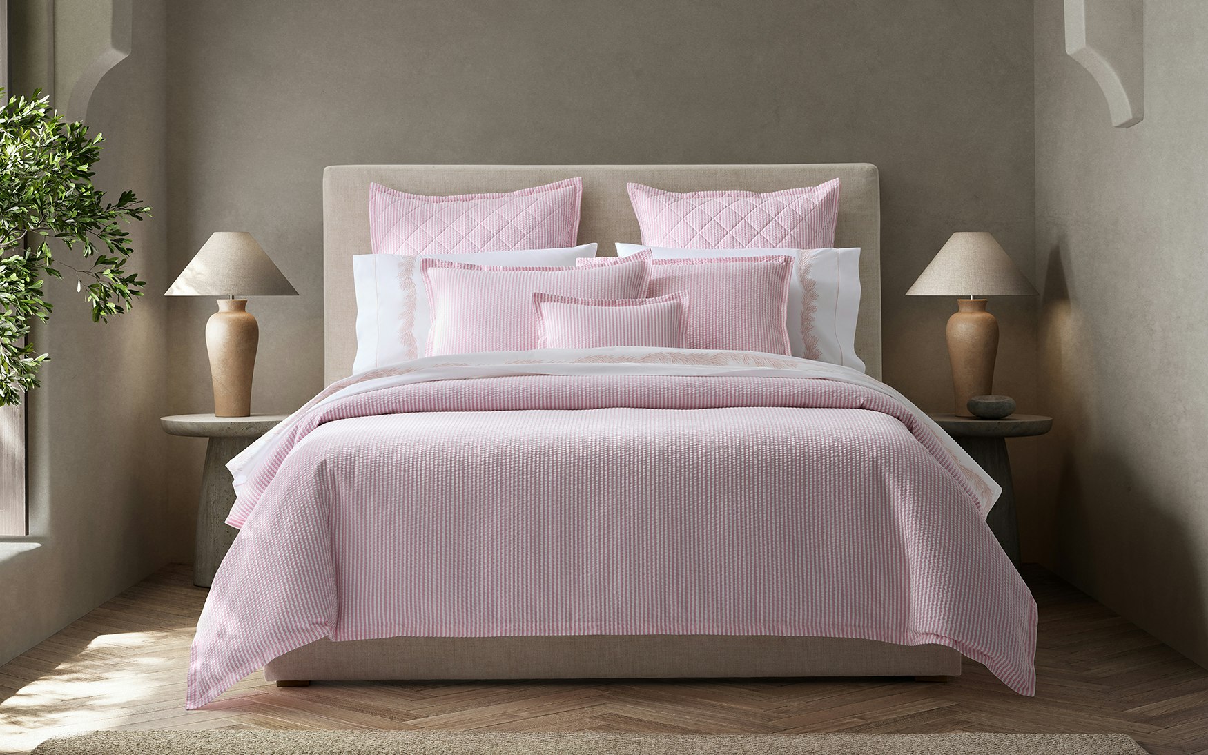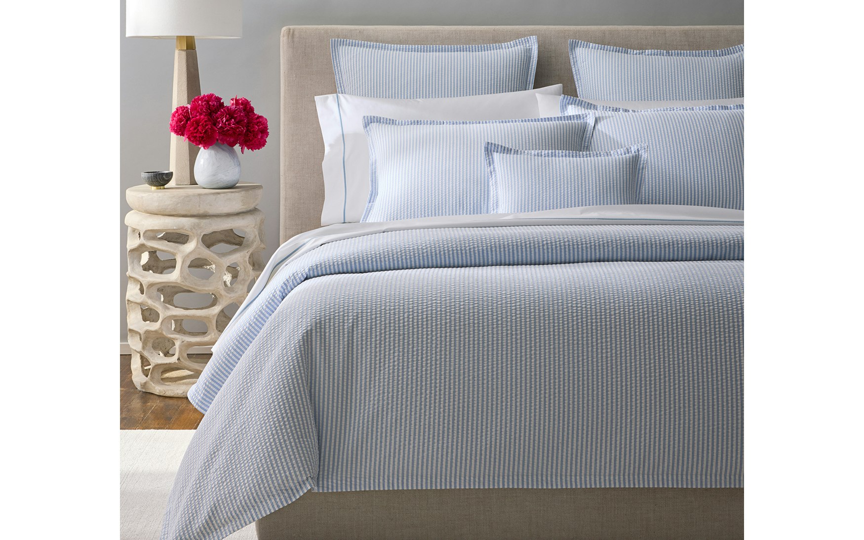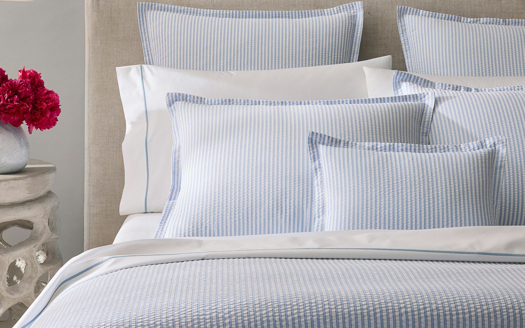 Matteo provides sophisticated top-of-bed options that evoke elegant menswear fabrics. Matouk's interpretation is sharp seersucker with an eye-catching two-toned stripe. You'll love its dapper look as a duvet, shams, and a quilt with a 4-inch diamond stitch pattern.