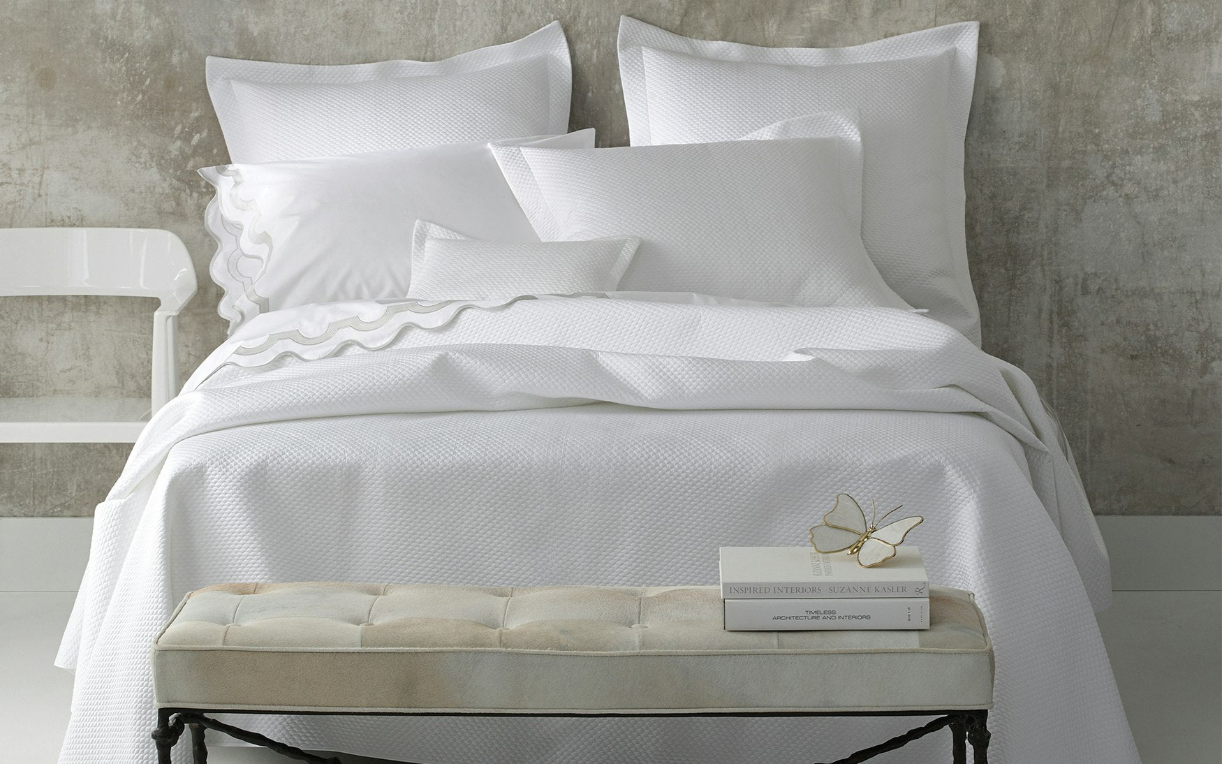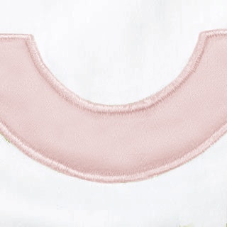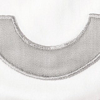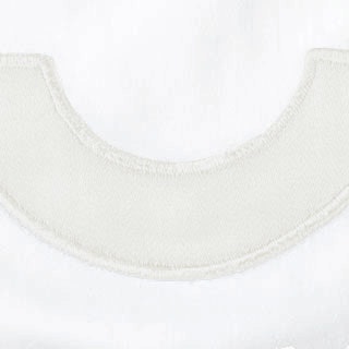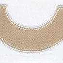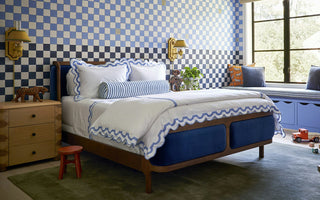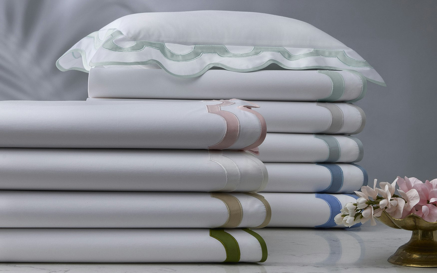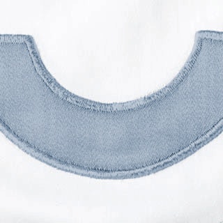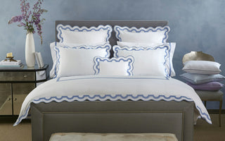 White Milano percale with contrasting appliqué arch border in Nocturne sateen 600 thread count Egyptian cotton woven in Italy.