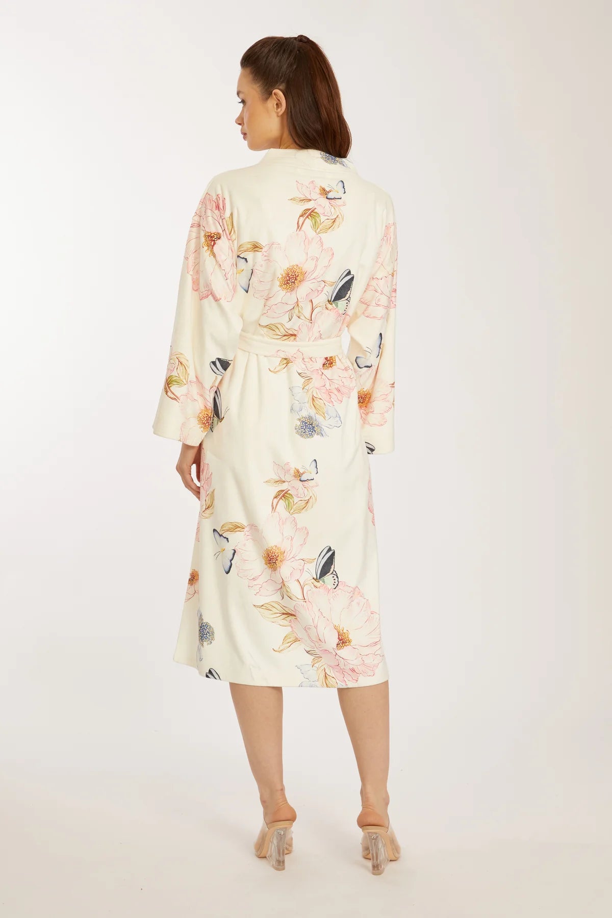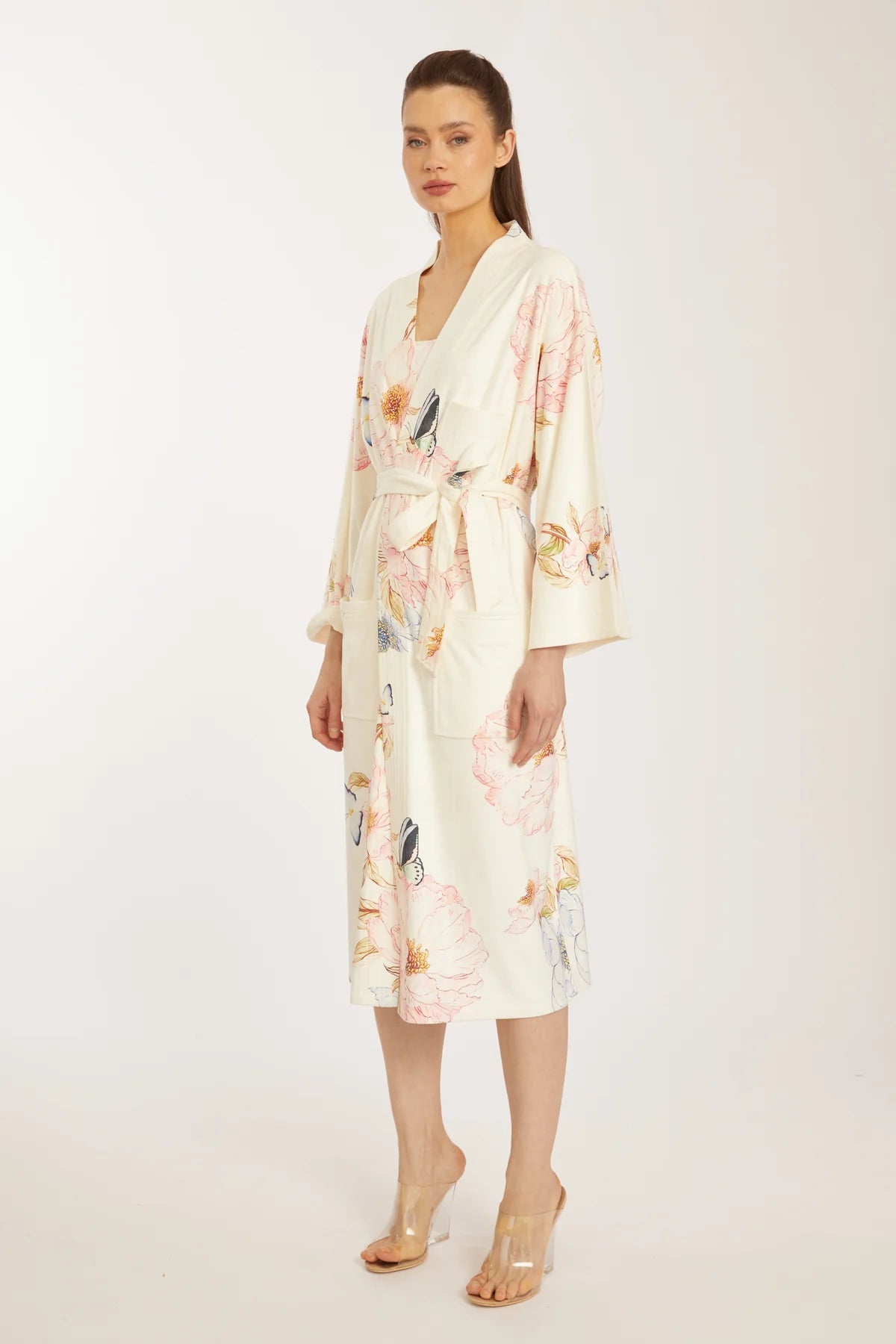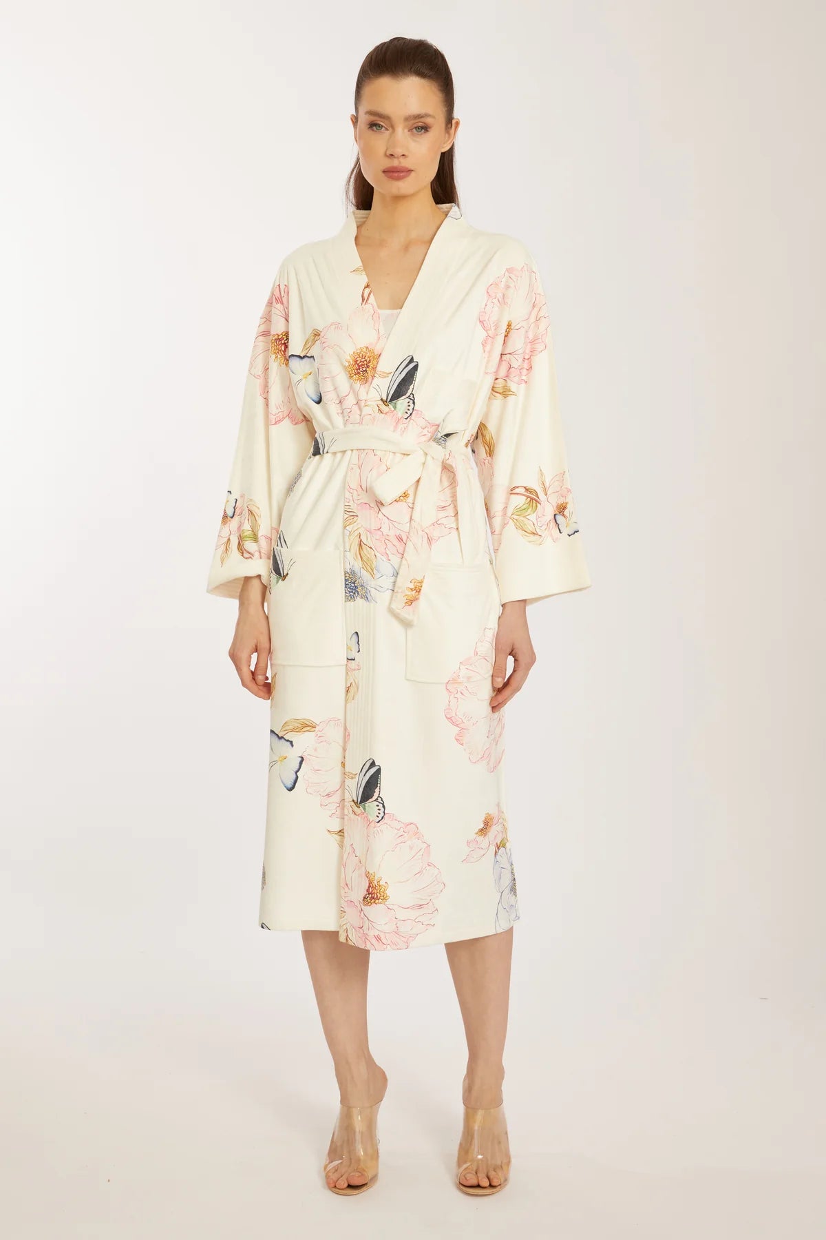 Delicate, graceful, and effortlessly enchanting—the Florenza Robe is a celebration of nature’s beauty and refined comfort. Crafted from signature ultra-soft microfiber, it offers a feather-light touch that gently drapes the body. The robe is adorned with a vibrant floral and soft blue butterfly print, infusing each moment with a sense of serenity and wonder.