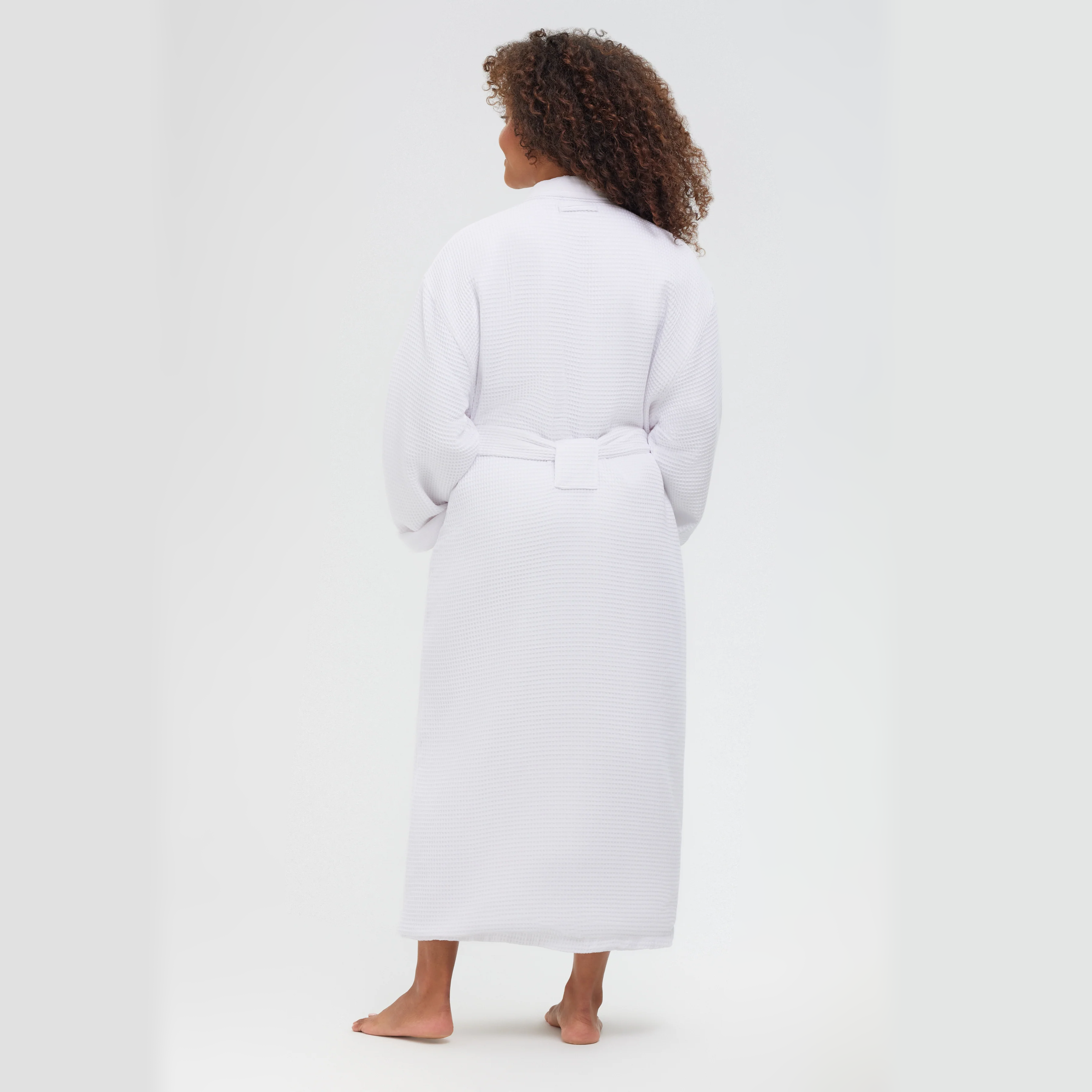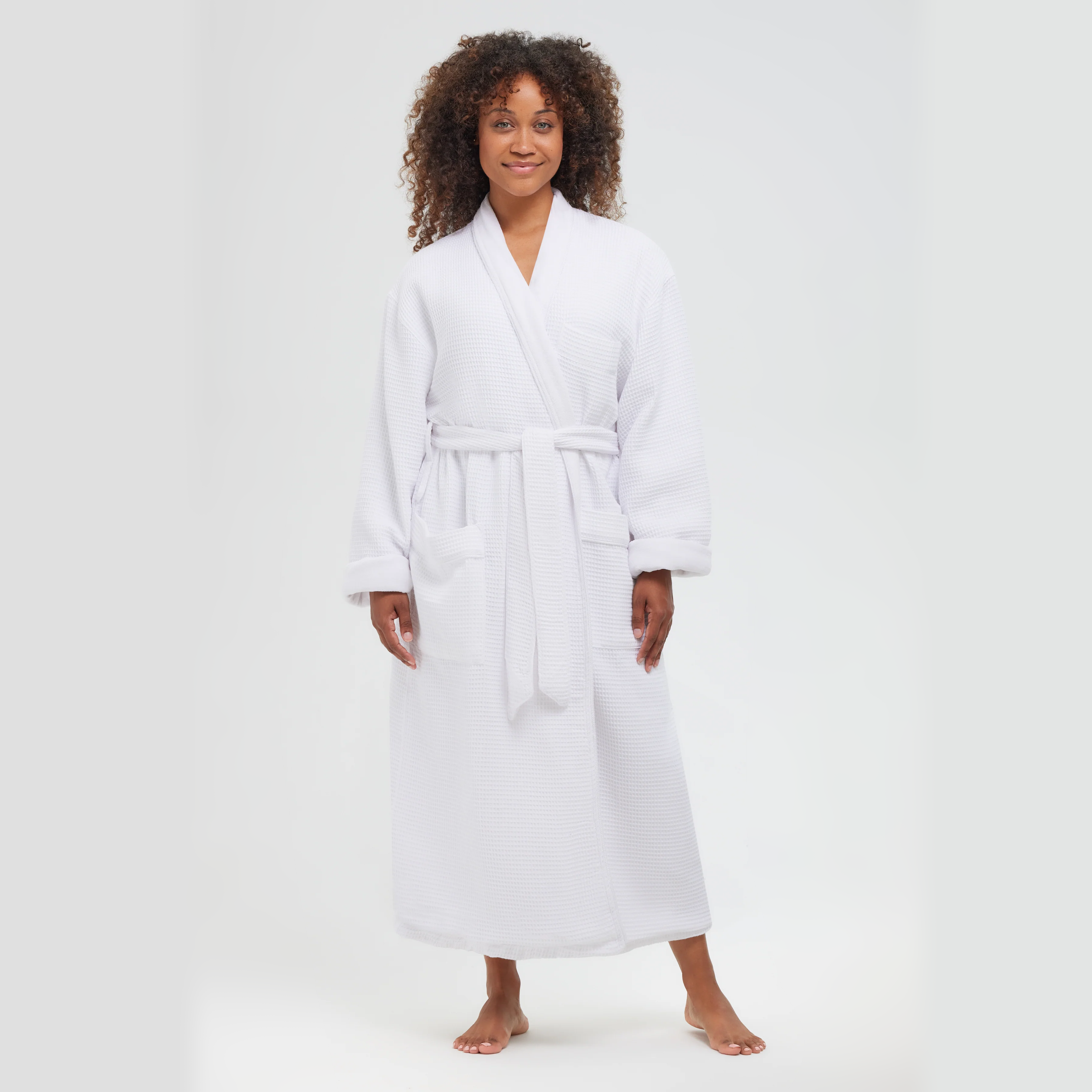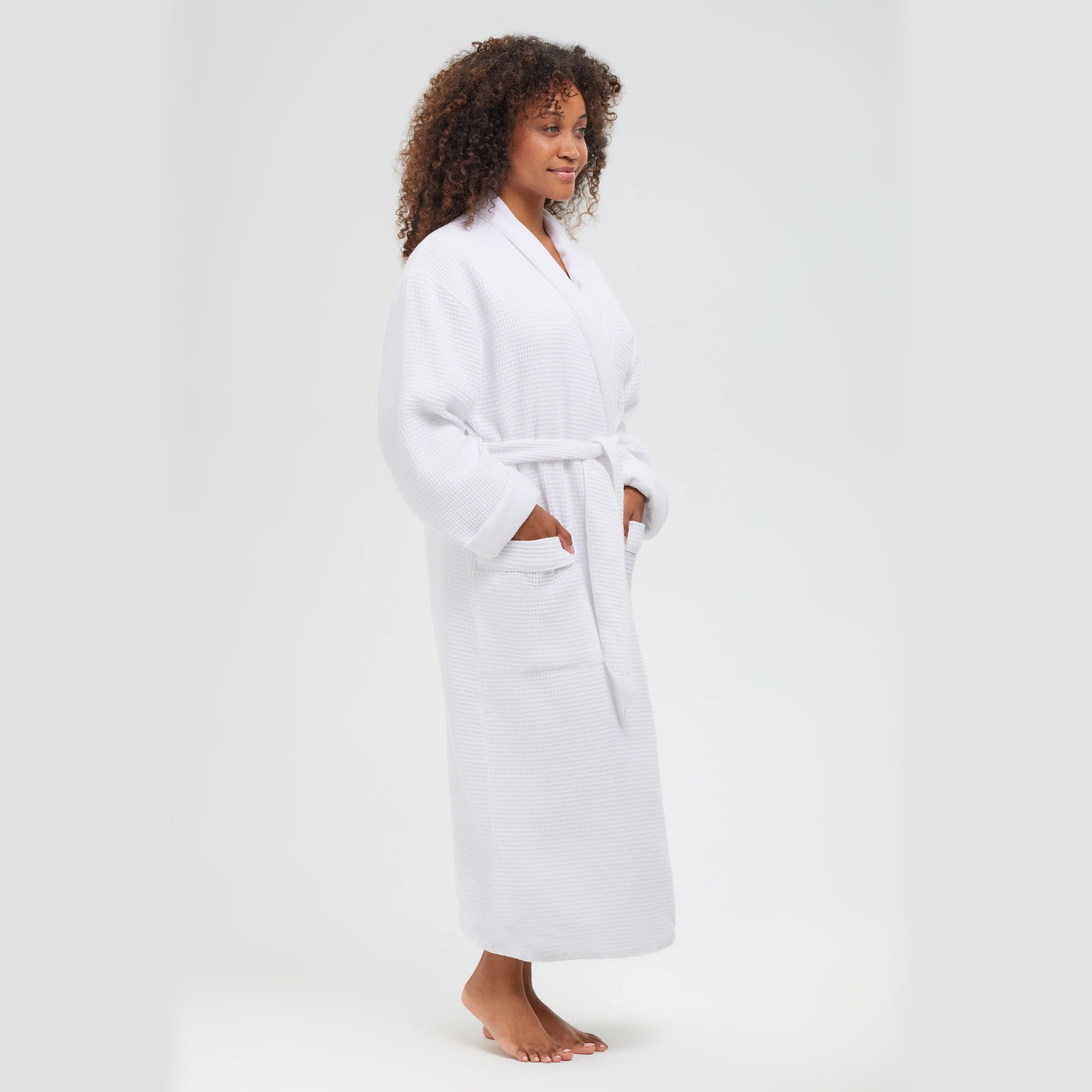 Lined waffle pique robes are spa favorites! The outside is a waffle pattern fabric, while the inside is super soft material. Combined they make a very lux robe! Bathrobe details include adjustable belt loops for flexible belt height, patch front hip pockets, cord accent piping and hanger loop for convenient storage. Featuring a welted breast pocket allowing embroidery free interior and fully closed hem, insuring tangle-free laundering.