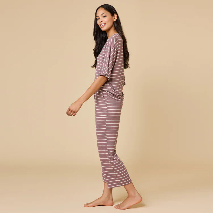 This opulent loungewear set elevates your lounging routine with an unconstrained, wide-leg cropped pant and V-neck top in buttery soft jersey fabric, enveloping you in an unmatched allure of luxury and sophistication. The ensemble boasts of a chic yet effortless silhouette that flatters every body type, while its two side pockets and elastic waistband ensure maximum convenience and comfort.