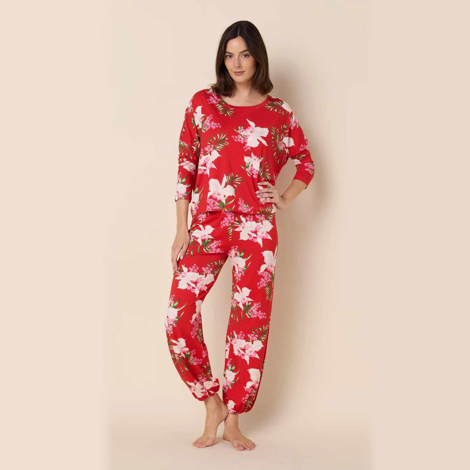 Hand-pulled Peruvian Pima cotton was the ideal starting point, prized for its silky luster and soft texture. To achieve the ultimate balance, it's blended with modal for a flattering drape and includes a touch of spandex for just the right amount of stretch and recovery, ensuring they move beautifully with you. The result is a decadent set made for lounging in absolute comfort.