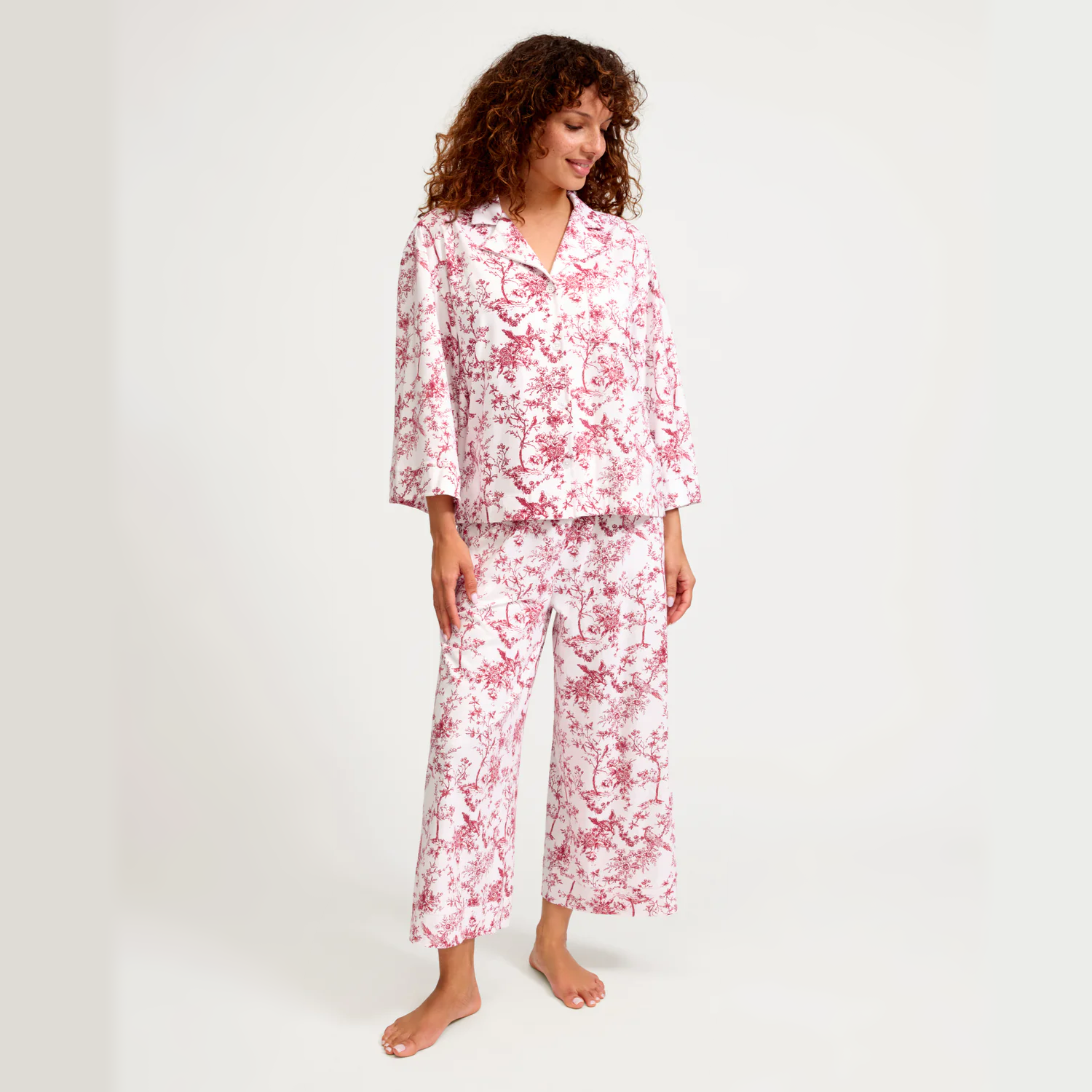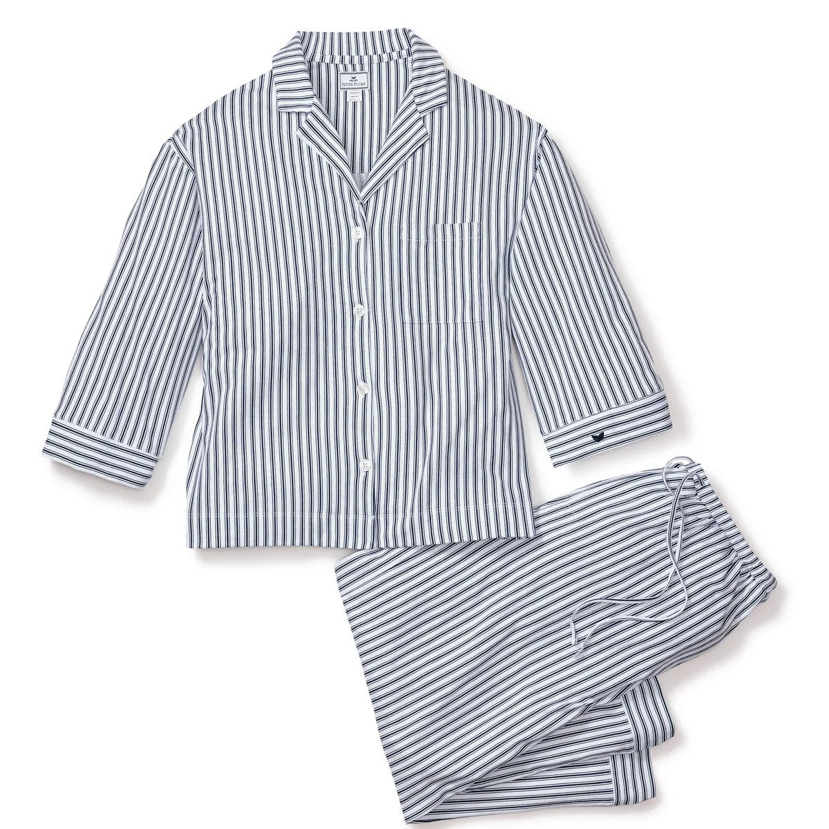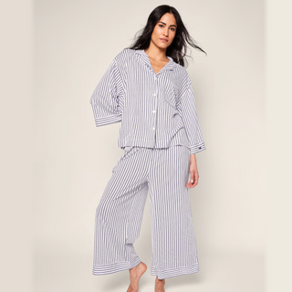 This wide-leg pajama set is the apex of comfort and feminine tailoring: a well-considered three-quarter length sleeve and a more generous pant leg that results in that refined swish-swish sensation at your ankle as you walk down a long hallway. Curl up in luxury and slip off to dreamland. Bonne nuit.