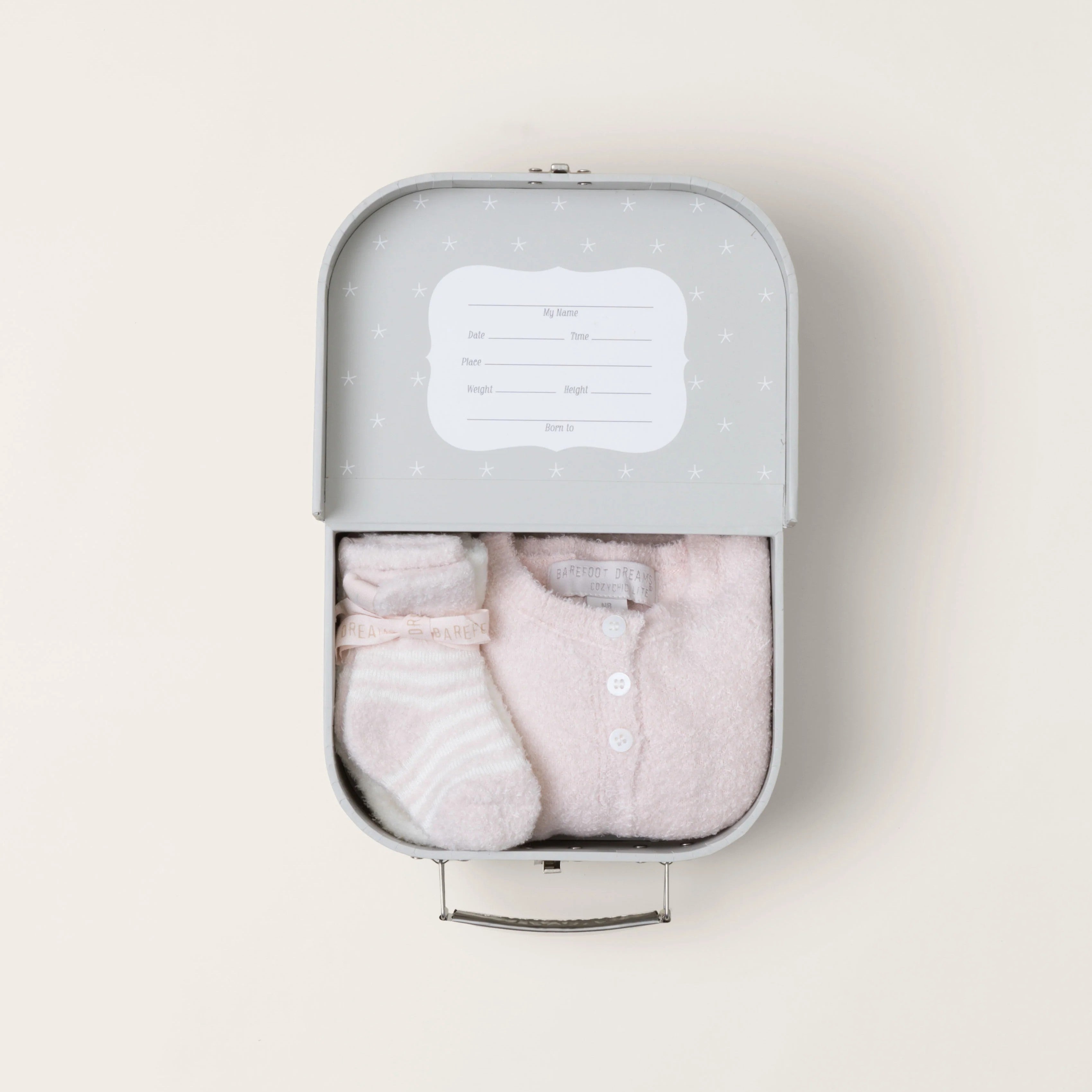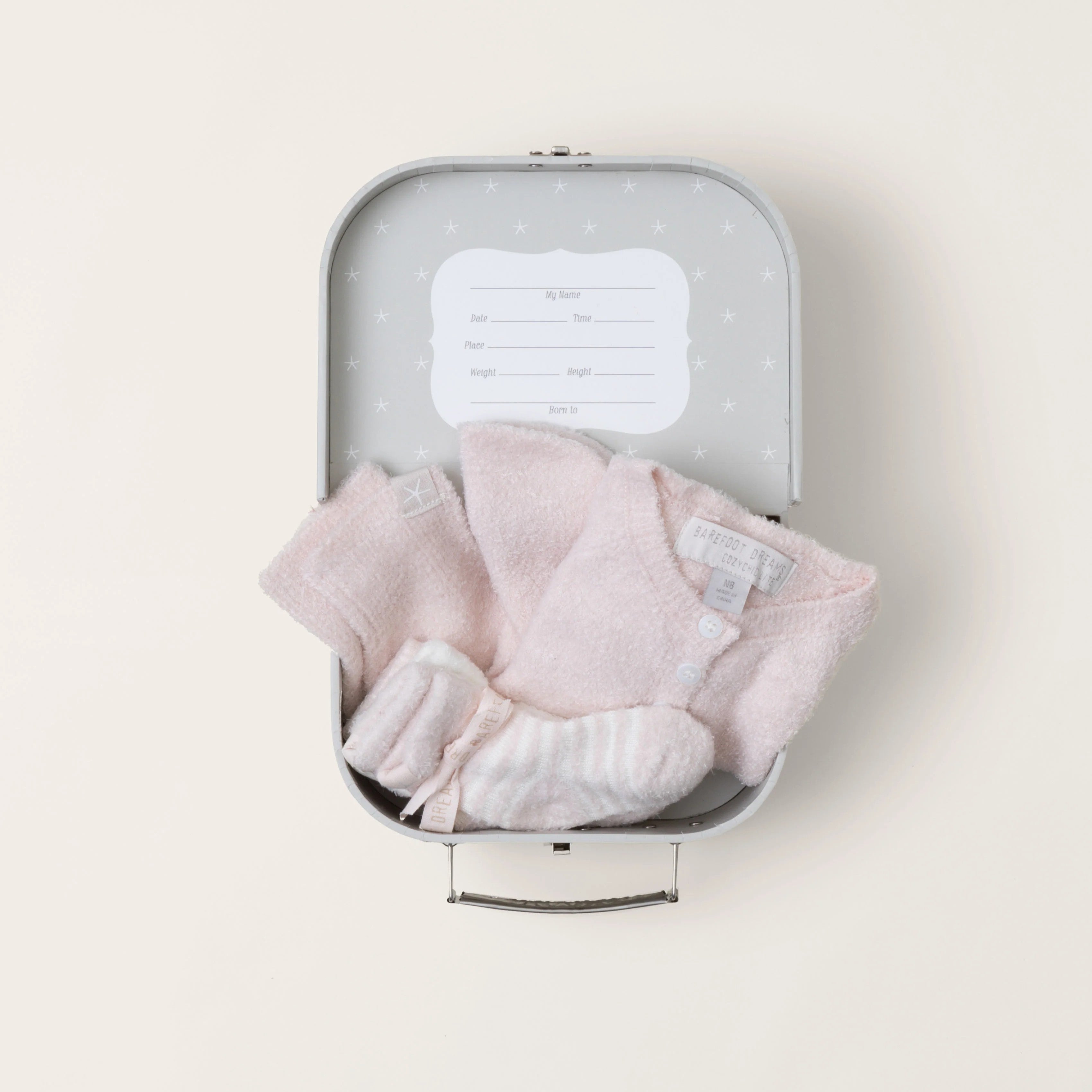 Coming home from the hospital just got sweeter with this newborn set. This is every newborn's must have when it comes to being enveloped in super soft, luxurious coziness for their first trip home. Each suitcase ensemble includes a cardigan, pull on pant, beanie and three pairs of socks. The suitcase doubles as the perfect keepsake box that details important info