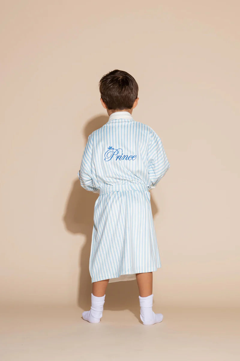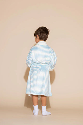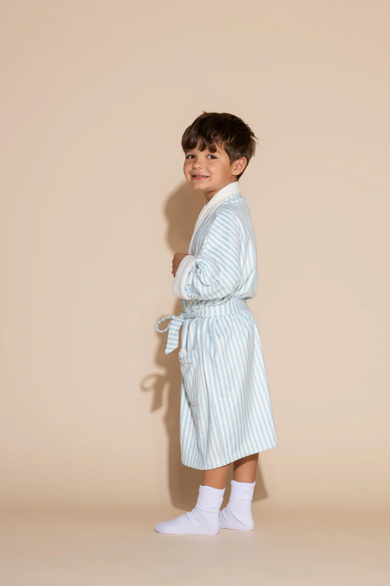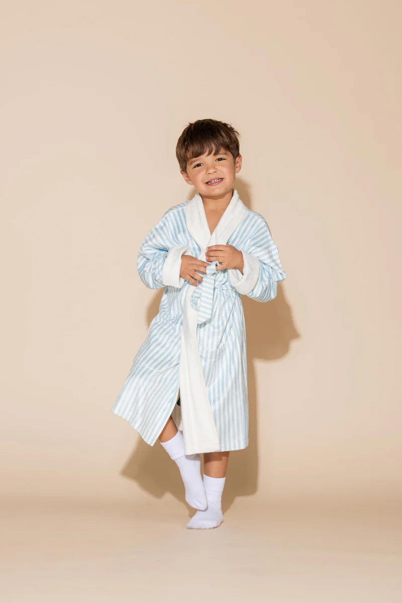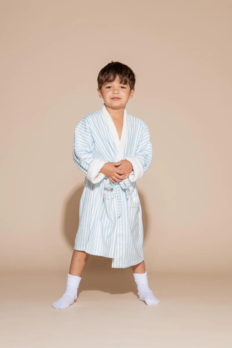 The Blue Stripes print kids robe is made from ultra-soft microfiber with a matching belt and shawl collar because luxe loungewear isn't just for adults.