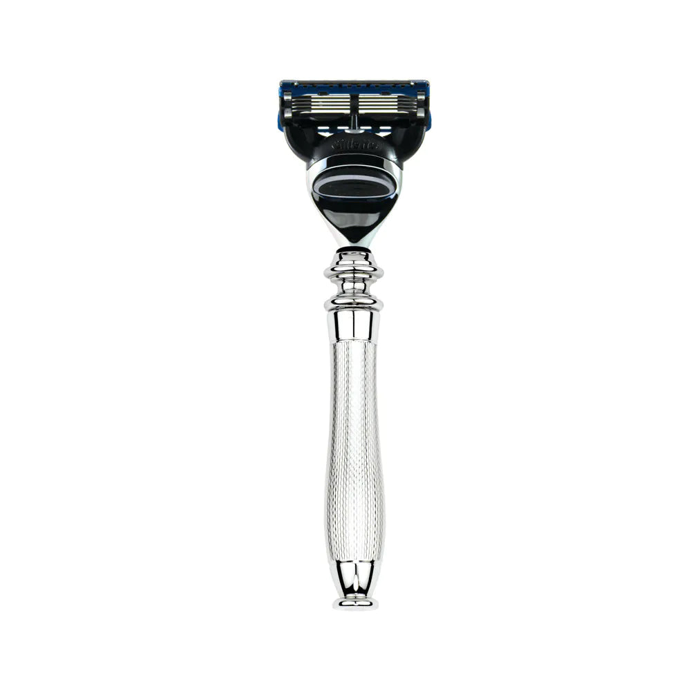Razor with hard chrome plated handle, Barley pattern collar, and Gillette Fusion Proglide razor head.