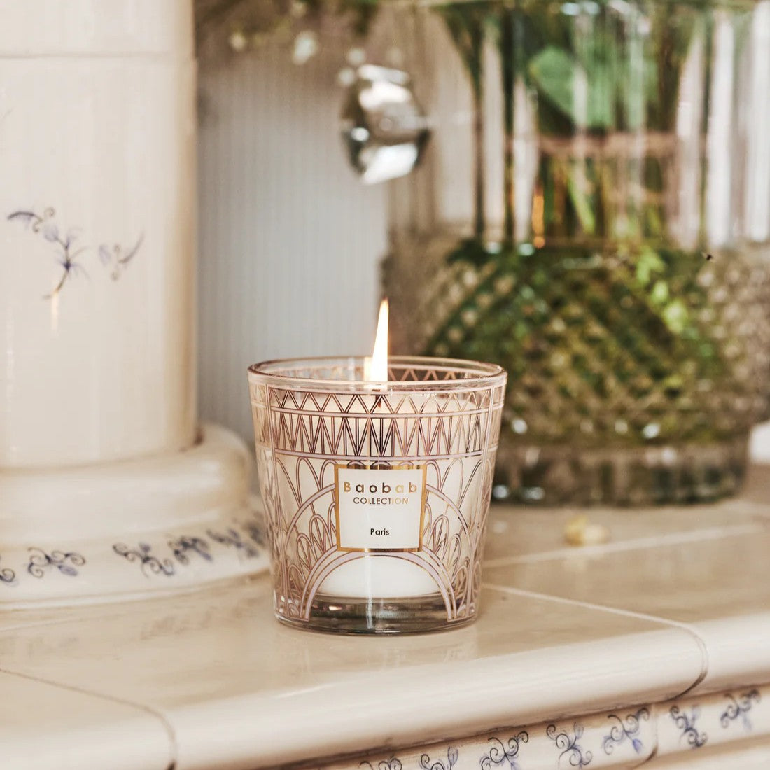 The Paris scented candle is decorated with a powder pink and gold silkscreen print that resembles the stylized structure of the Eiffel Tower. We celebrate the beautiful month of May in Paris, memories of chestnut and green blossoms.