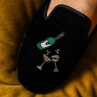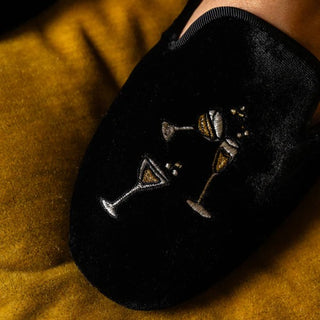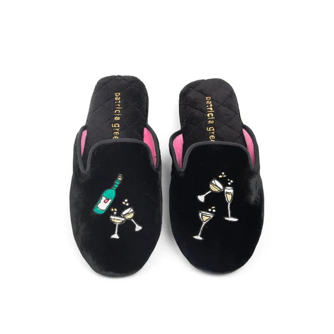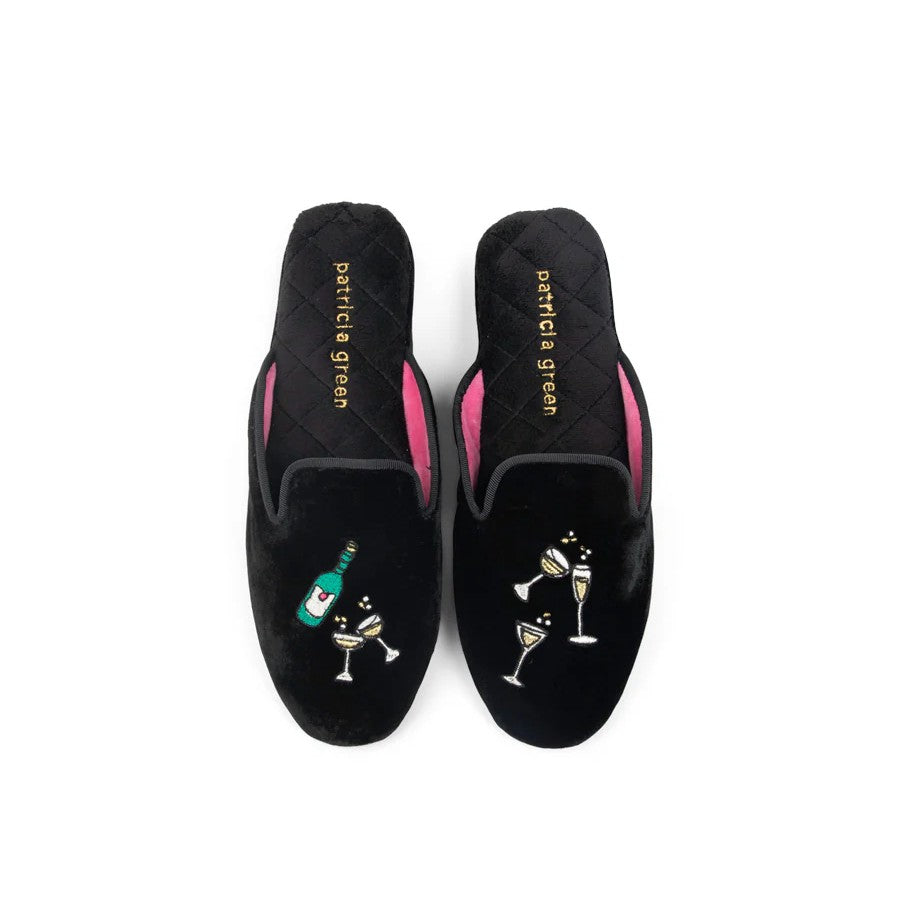 Step into luxury and fun with the Champagne Slippers, perfect for lounging in ultimate comfort. Crafted from plush black velvet with a cozy lining, these chic slippers feature playful embroidered champagne bottles and bubbling glasses for a touch of sparkle. Designed for both comfort and sophistication, the cushioned insole and durable sole make them ideal for relaxing at home or gifting to someone special. Designed by Patricia Green herself, with a mission to design and develop footwear collections for the contemporary woman.