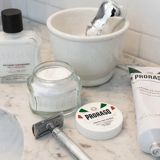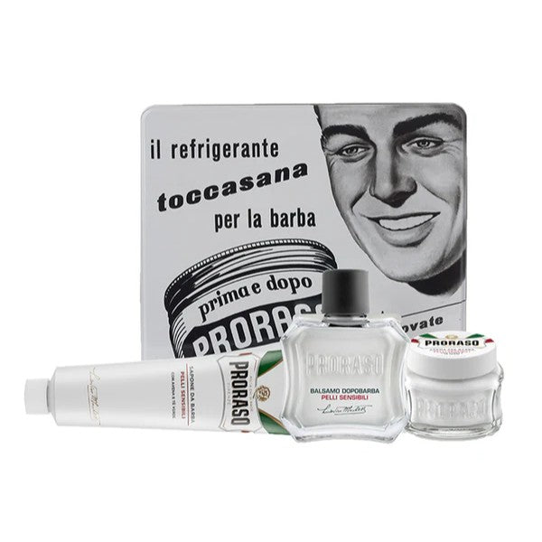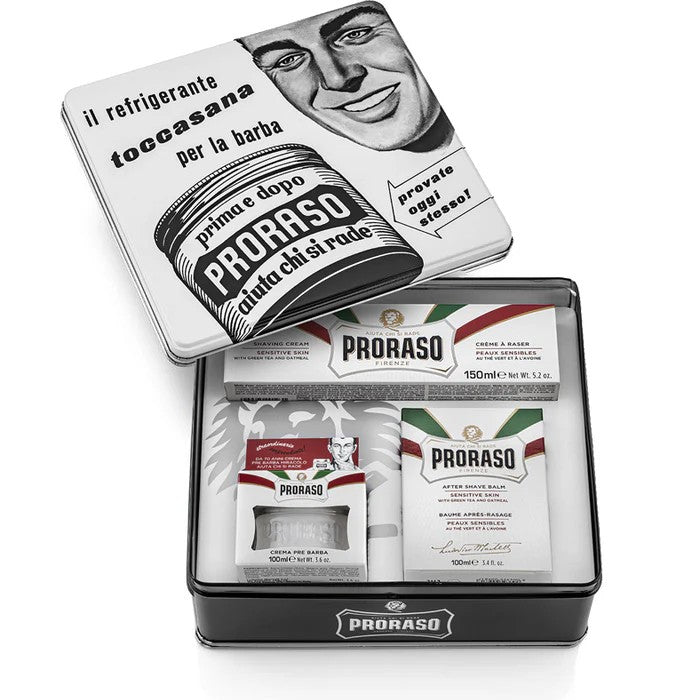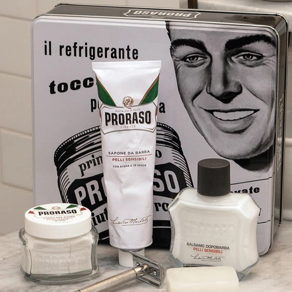 These images are as legendary as the shaving products, conveying impeccable Italian taste and the history of a brand synonymous with quality in the shaving world for nearly a century. Now they’ve come together in this collectible tin, featuring iconic advertising from the 1950’s as a tribute to the history of the brand, and including the three essentials for the classic Proraso Shave at home, all in the White/Sensitive Skin Formula with Green Tea and Oatmeal.