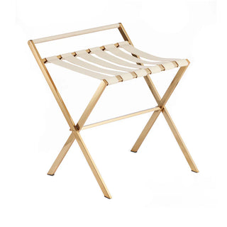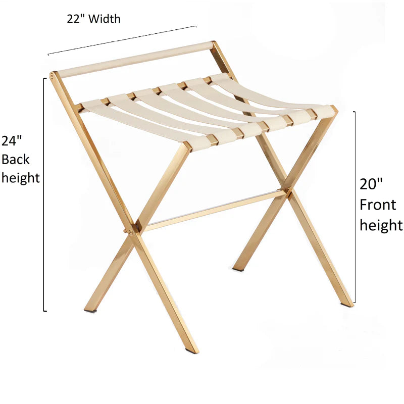 Best quality hotel luggage stand used in five-star resorts worldwide in gold metal with double sided leatherette ivory straps, coordinating stitching on straps with a rear bumper guard to protect your walls from scratches and dings.