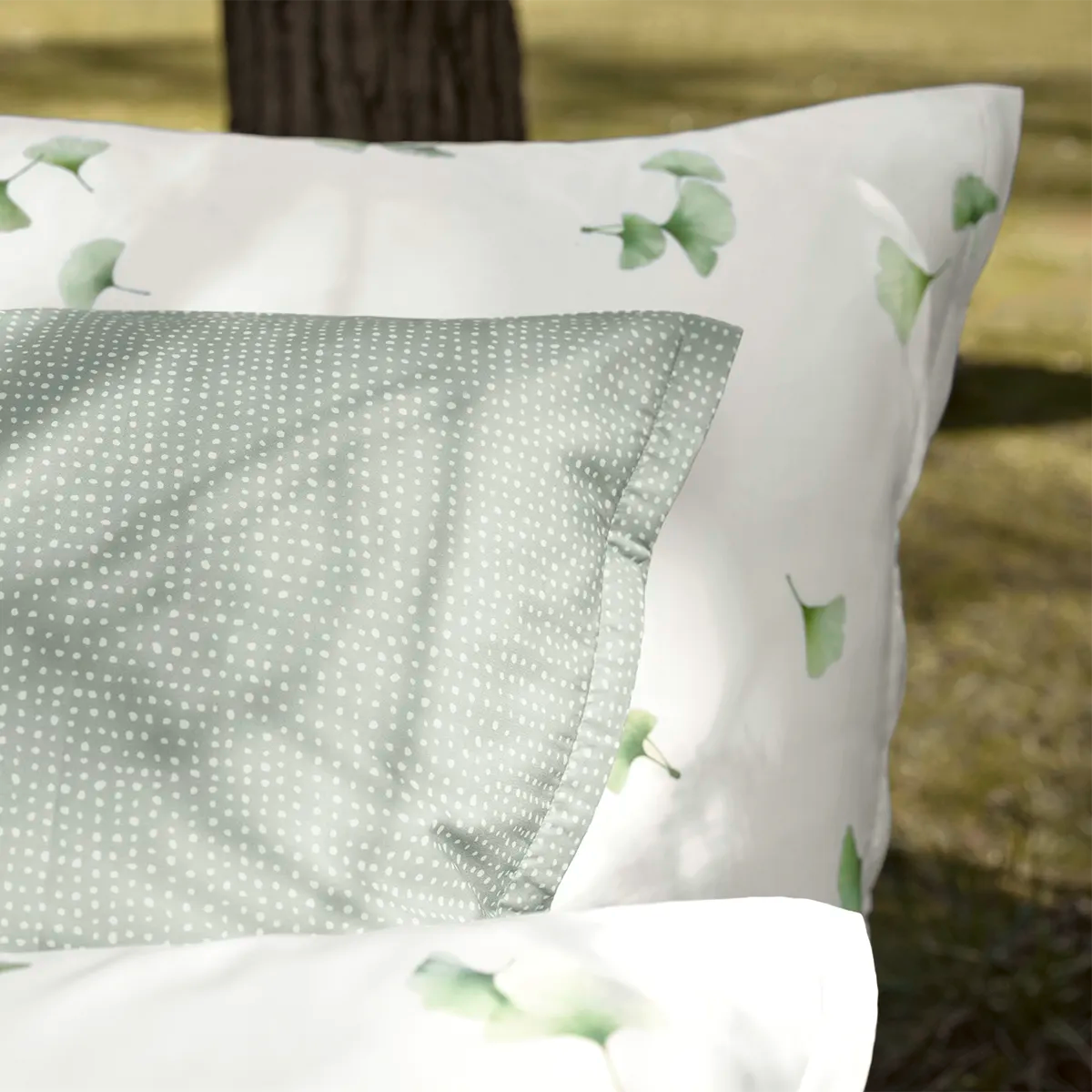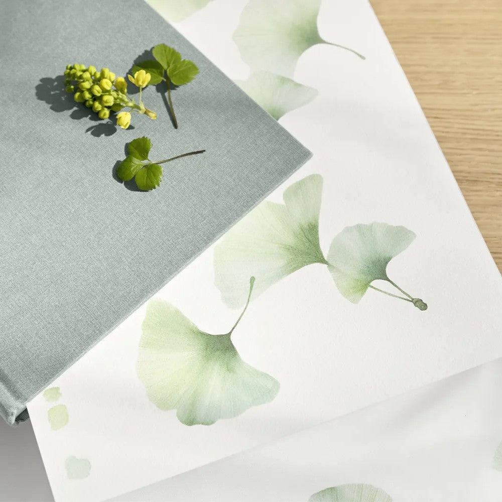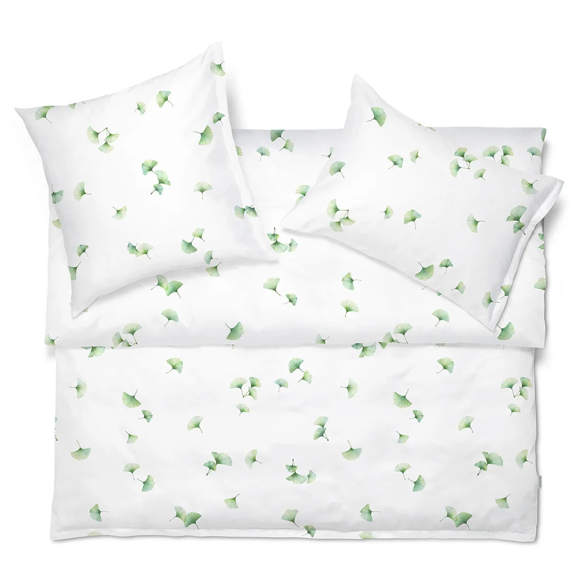 On the AIKO bed linen, delicate ginkgo leaves in nuanced shades of green float across the pure white satin—almost as if dancing in a gentle summer breeze. The watercolor painting technique lends these delicate leaves a slight transparency, while the subtle color gradients and fine details of the leaf veins add depth and a touch of naturalness. This understated, simple design is guaranteed to give your bedroom a unique, Zen-garden feel. 100% pure long-staple, combed, mercerized cotton. Weighed at 110 g/m2.