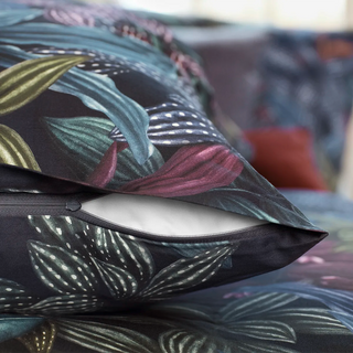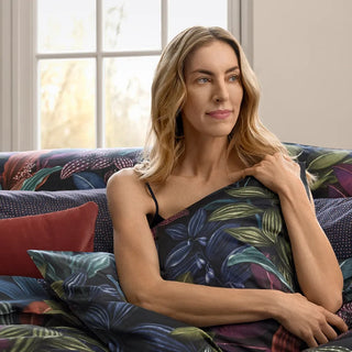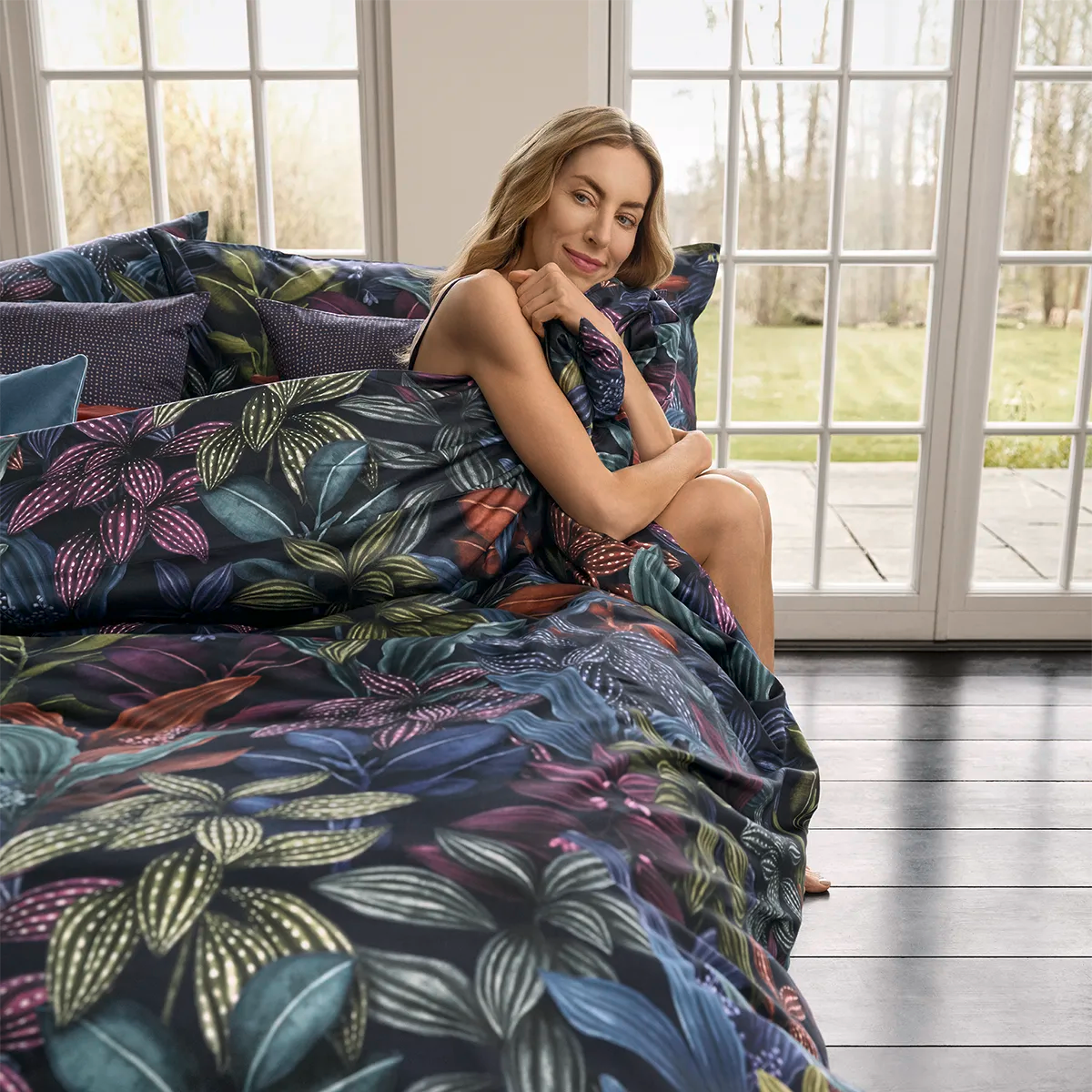 A mysterious whisper rustles through the dense foliage of the ARAMIS bed linen, but it could also be the gentle whisper of the wind. This diverse fantasy forest of gouache colors in bright copper red, magenta, olive, sea green, and royal blue creates a magical allure on the satin weave or jersey fabric. While the dark blue tones guide you into the depths of your own enchanting dream worlds, bright, vibrant accents skillfully distract your gaze. 100% pure long-staple, combed, mercerized cotton. Weighed at 110 g/m2.