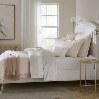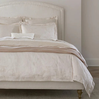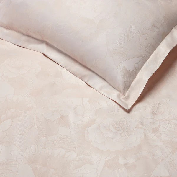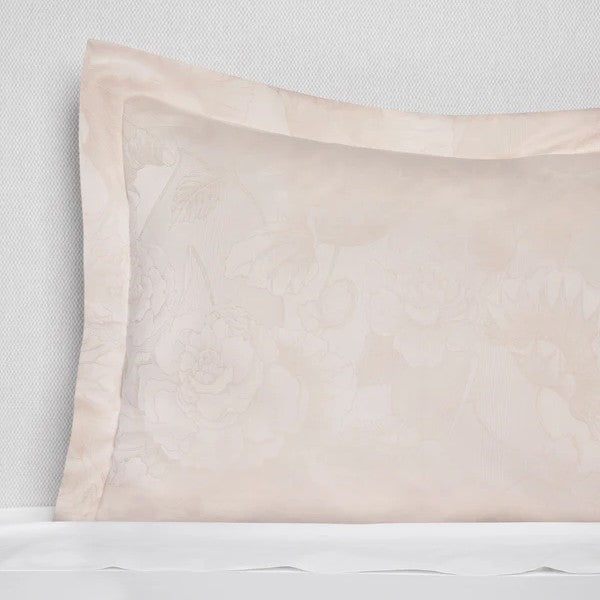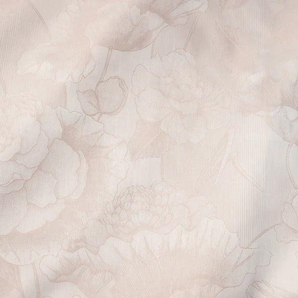 Adrina’s sweet disposition unfolds in soft blush and cameo, where florals bloom across a lustrous Italian-woven sateen jacquard. Delicately etched and rich in texture, each intricate line feels like a whispered touch of artistry, an expression of feminine elegance in its most refined form.