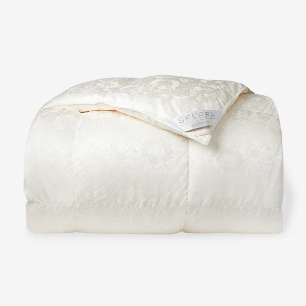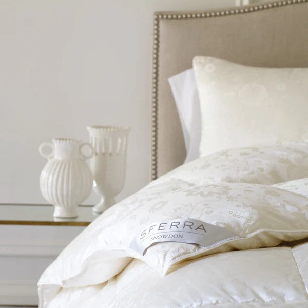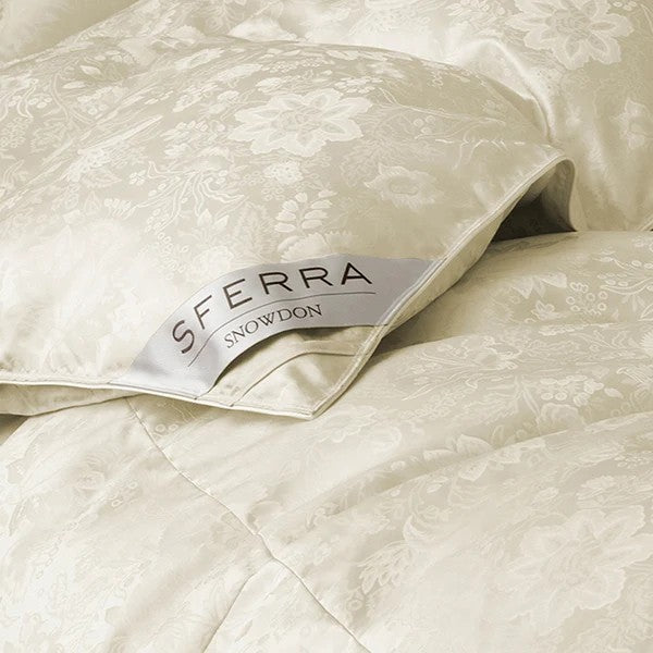 The coziest of nights call for the most premium level of down plumes. This Snowdon duvet is filled with SFERRA's highest fill-power down yet and offers unparalleled thermal insulation. Encased in a silky jacquard fabric, this soft and lofty down will define your sleeping experience.